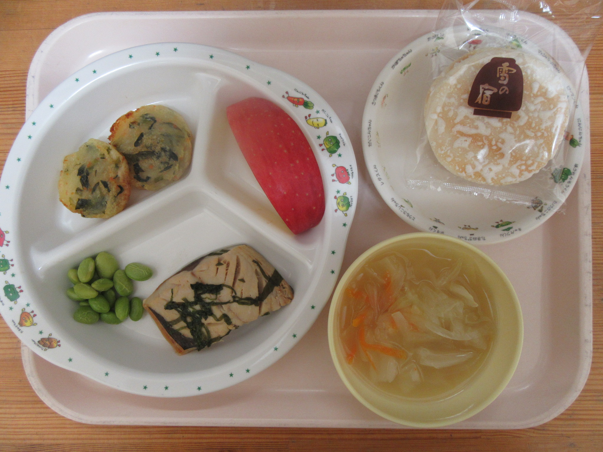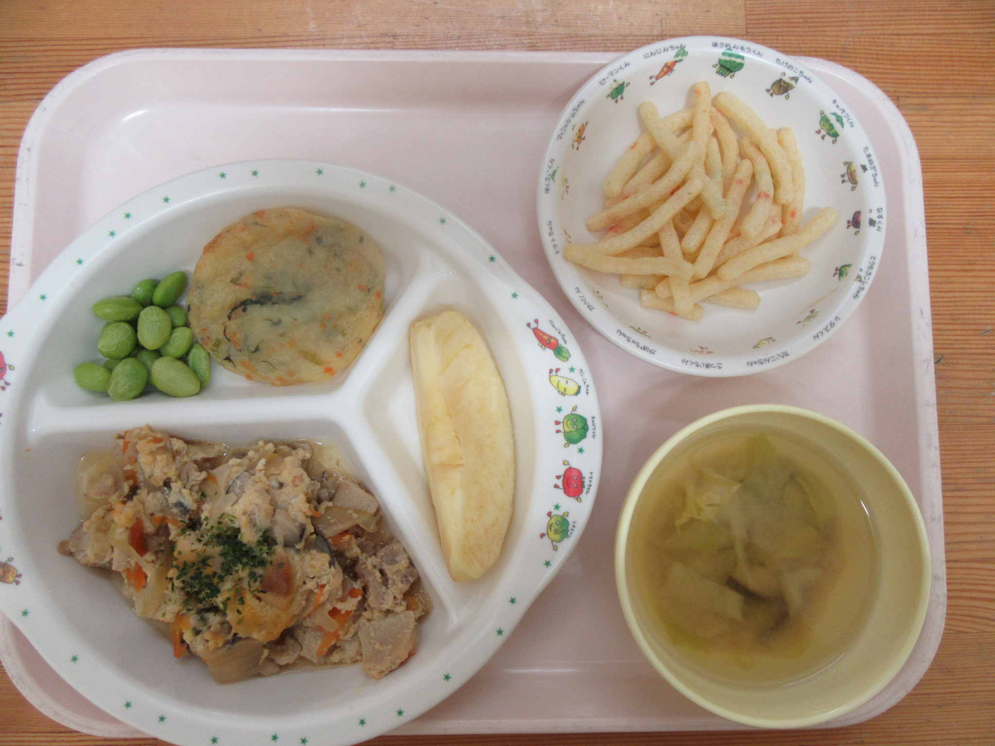 ・高野豆腐の卵とじ ・小松菜のポテトおやき風 ・枝豆 ・キャベツとしいたけの味噌汁 ・リンゴ
