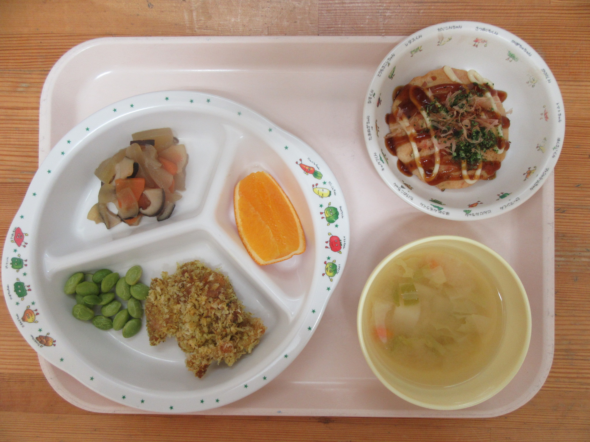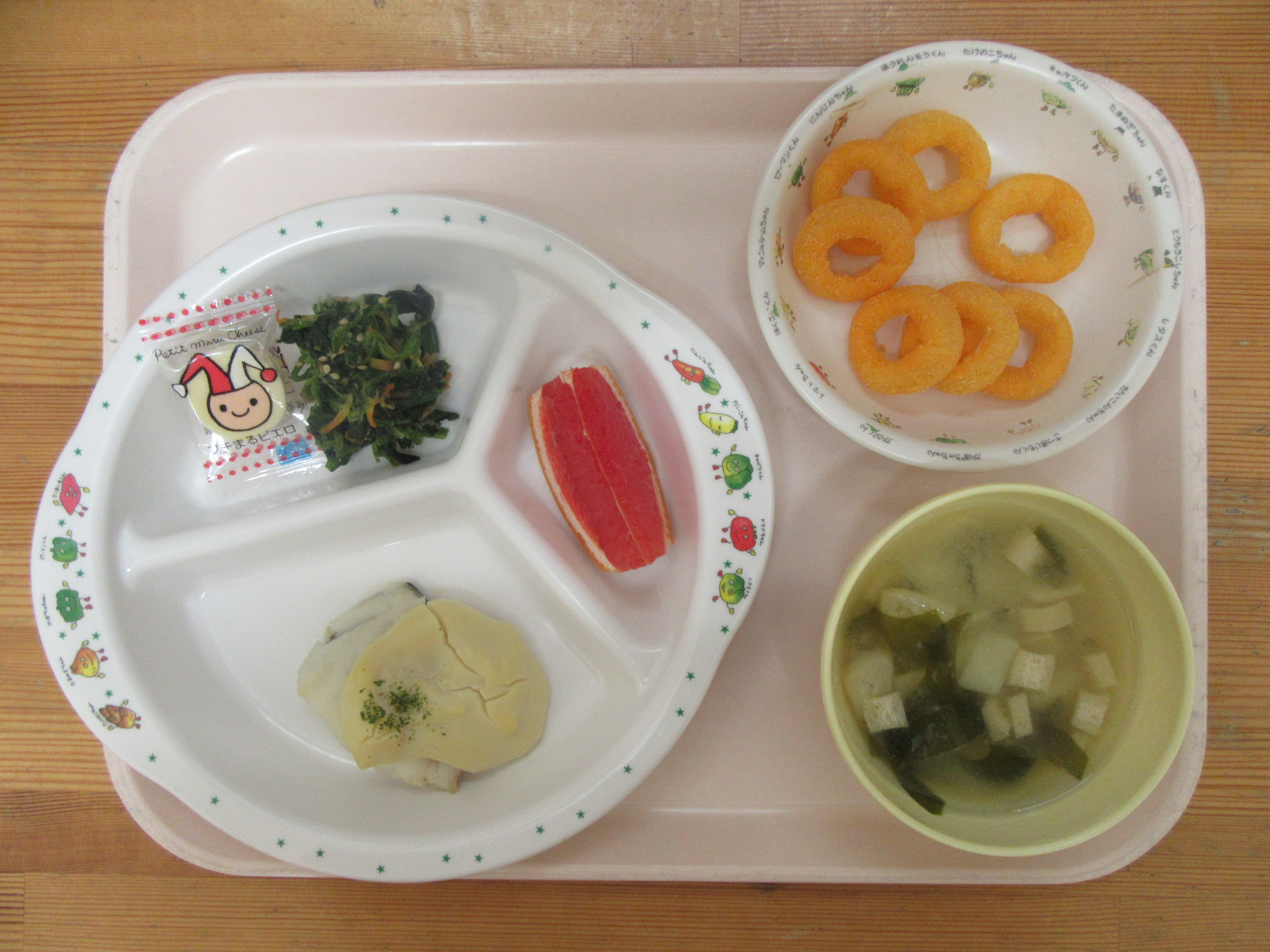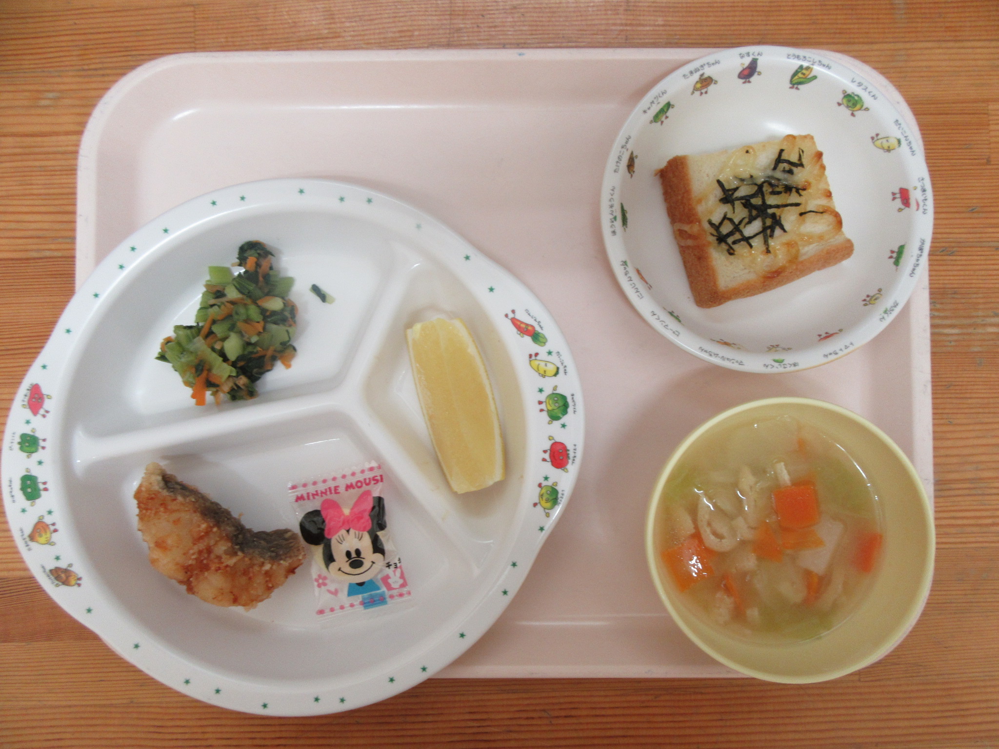 ・タラの竜田揚げ ・小松菜と人参のなめたけ和え ・チーズ ・キャベツと人参の味噌汁 ・グレープフルーツ