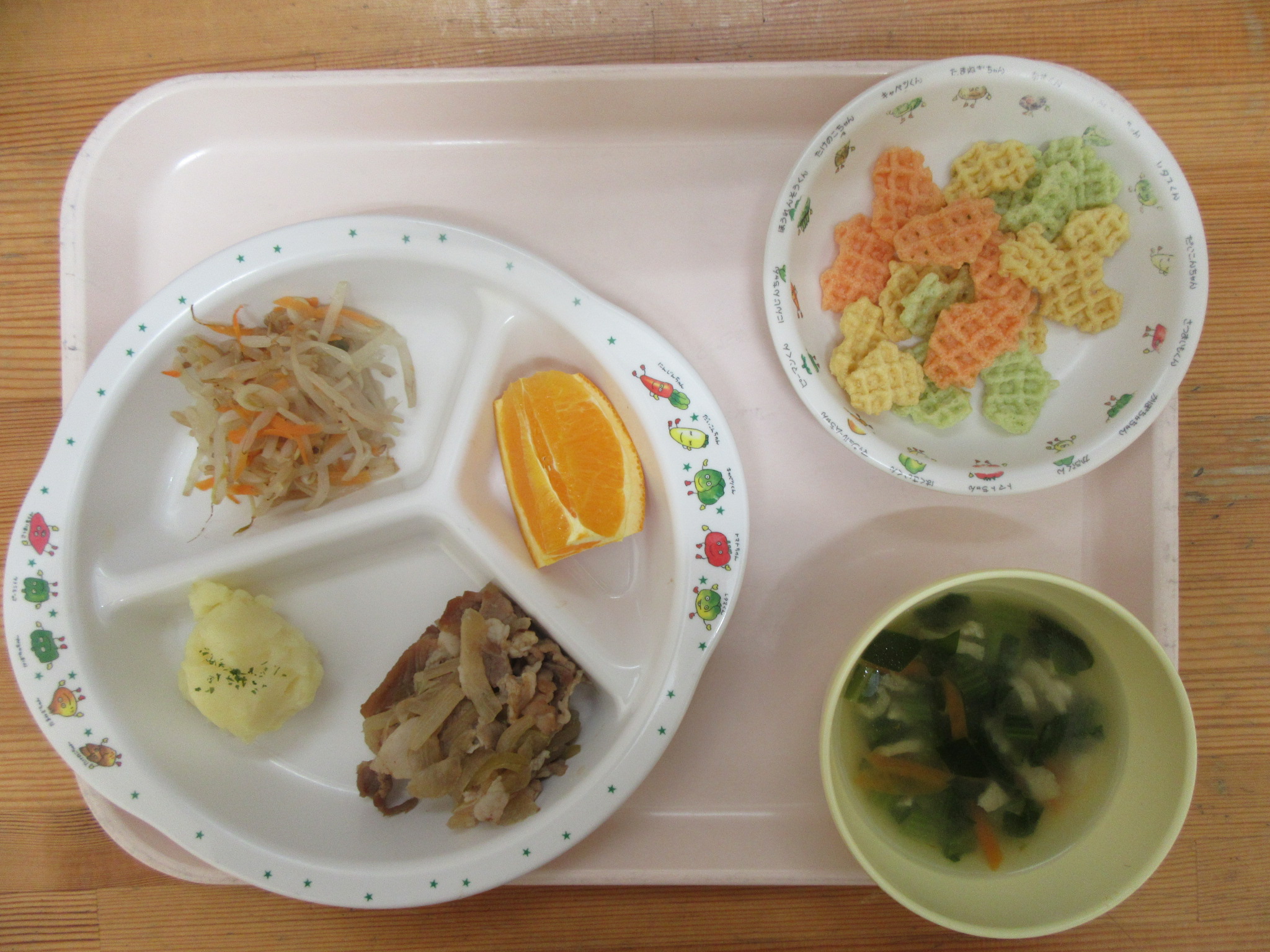 ・豚肉の生姜焼き ・もやしのナムル ・マッシュポテト ・小松菜と油揚げの味噌汁 ・オレンジ