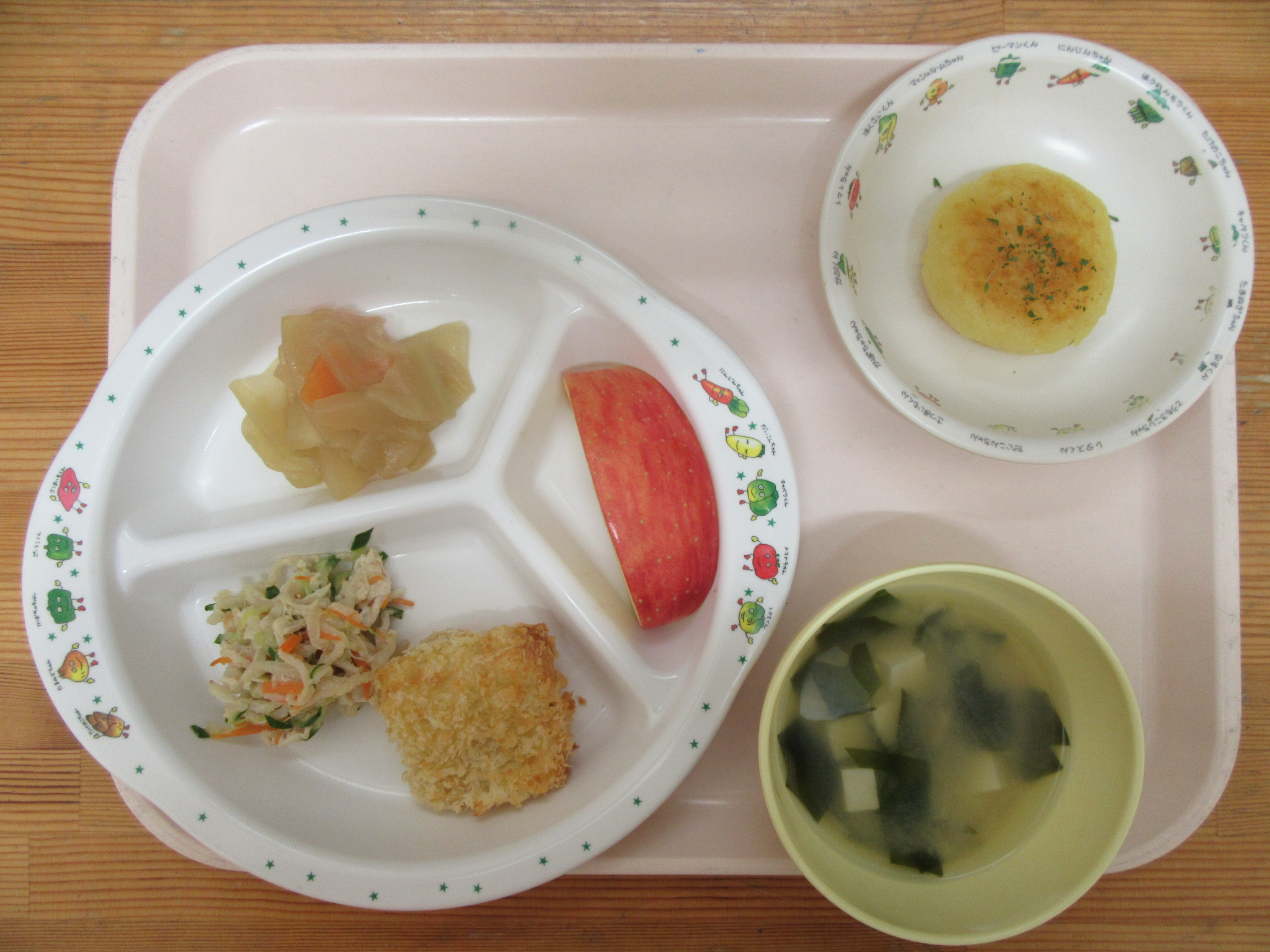 ・鮭のパン粉焼き ・キャベツの信田煮 ・チーズ ・なめこの味噌汁 ・バナナ