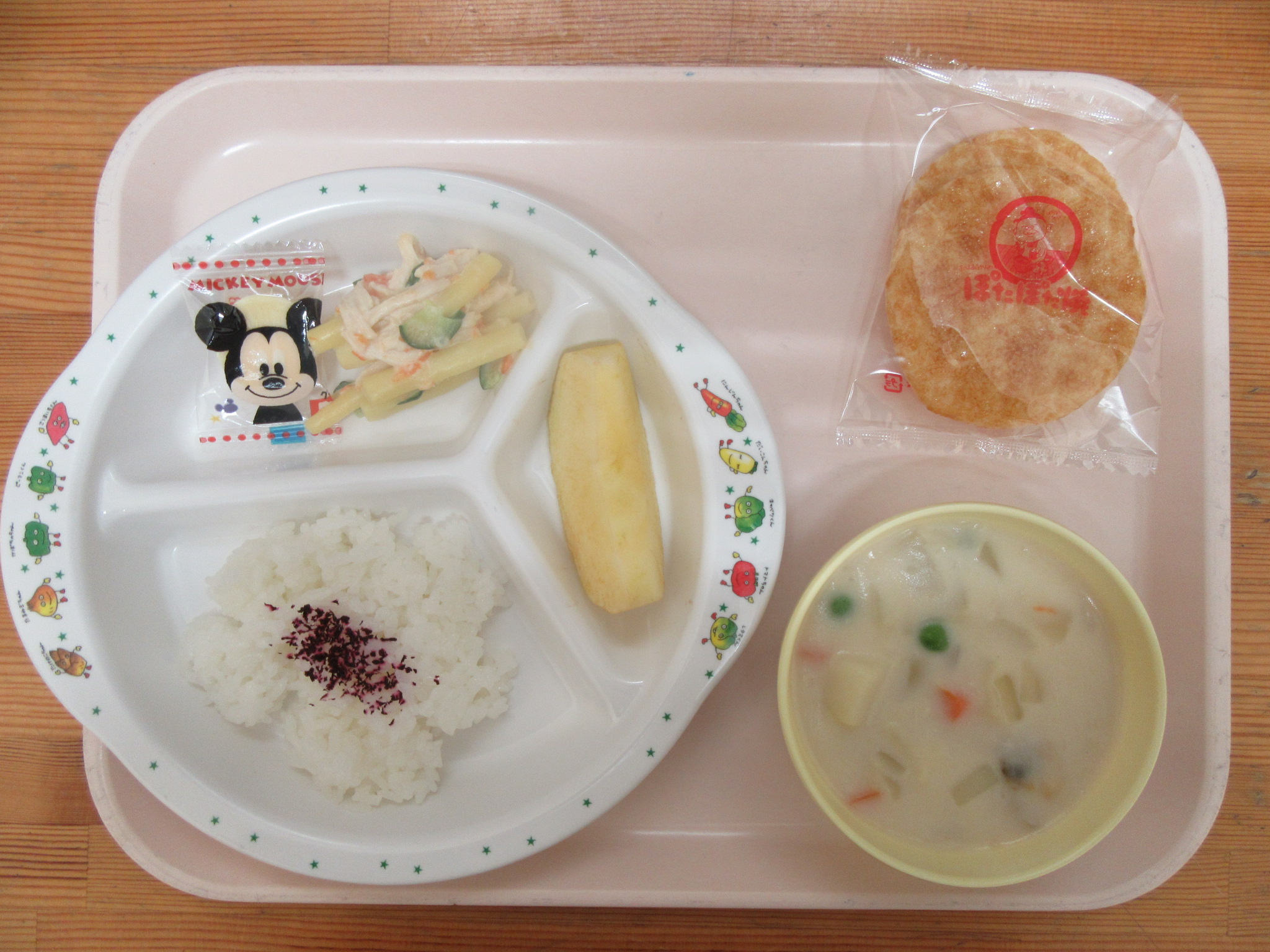 ・クラムチャウダー ・ゆかりごはん ・マカロニサラダ ・チーズ ・リンゴ