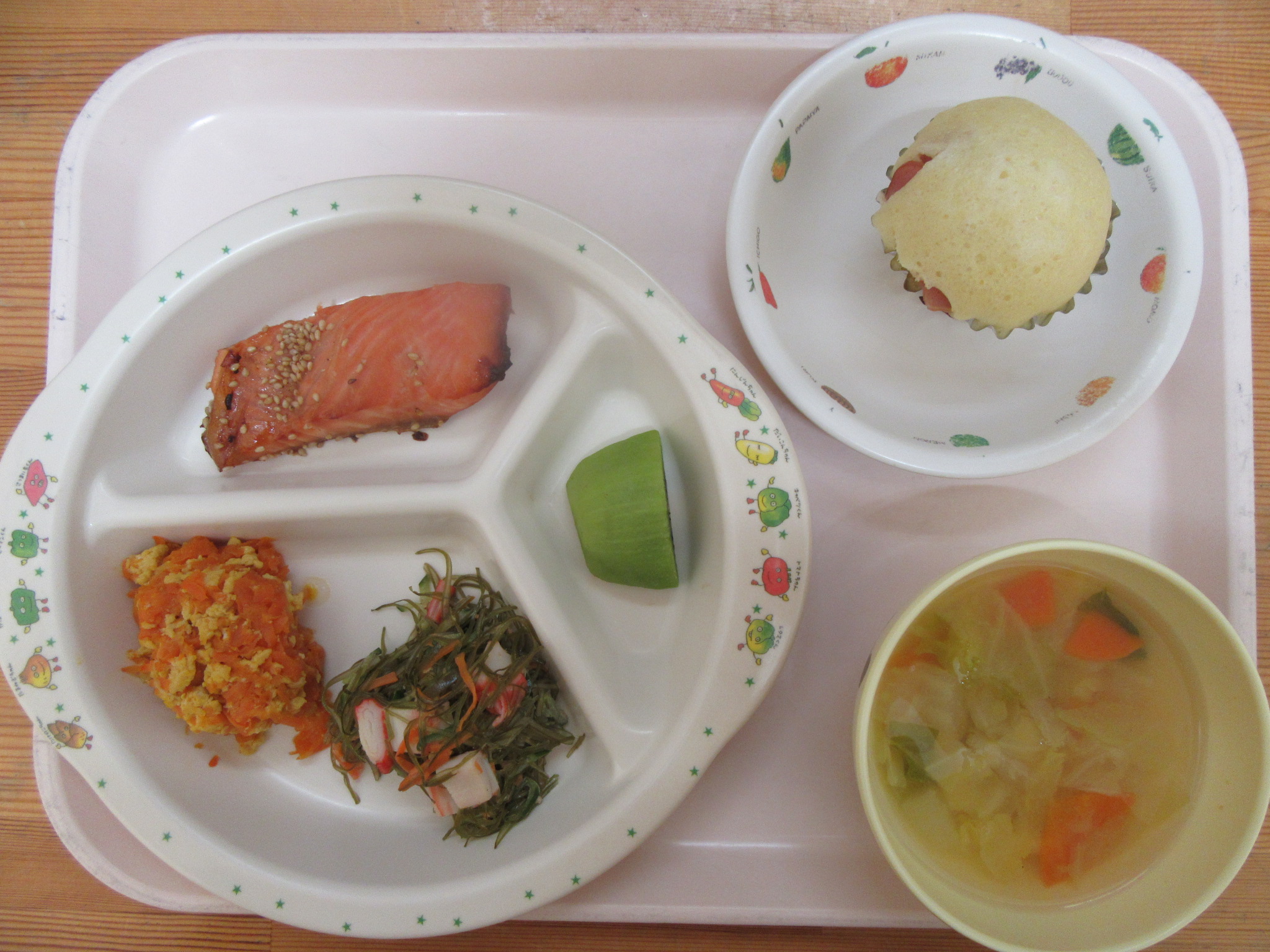 ・鮭の胡麻焼き ・引き昆布のサラダ ・にんじんしりしり ・白菜と高野豆腐の味噌汁 ・キウイ