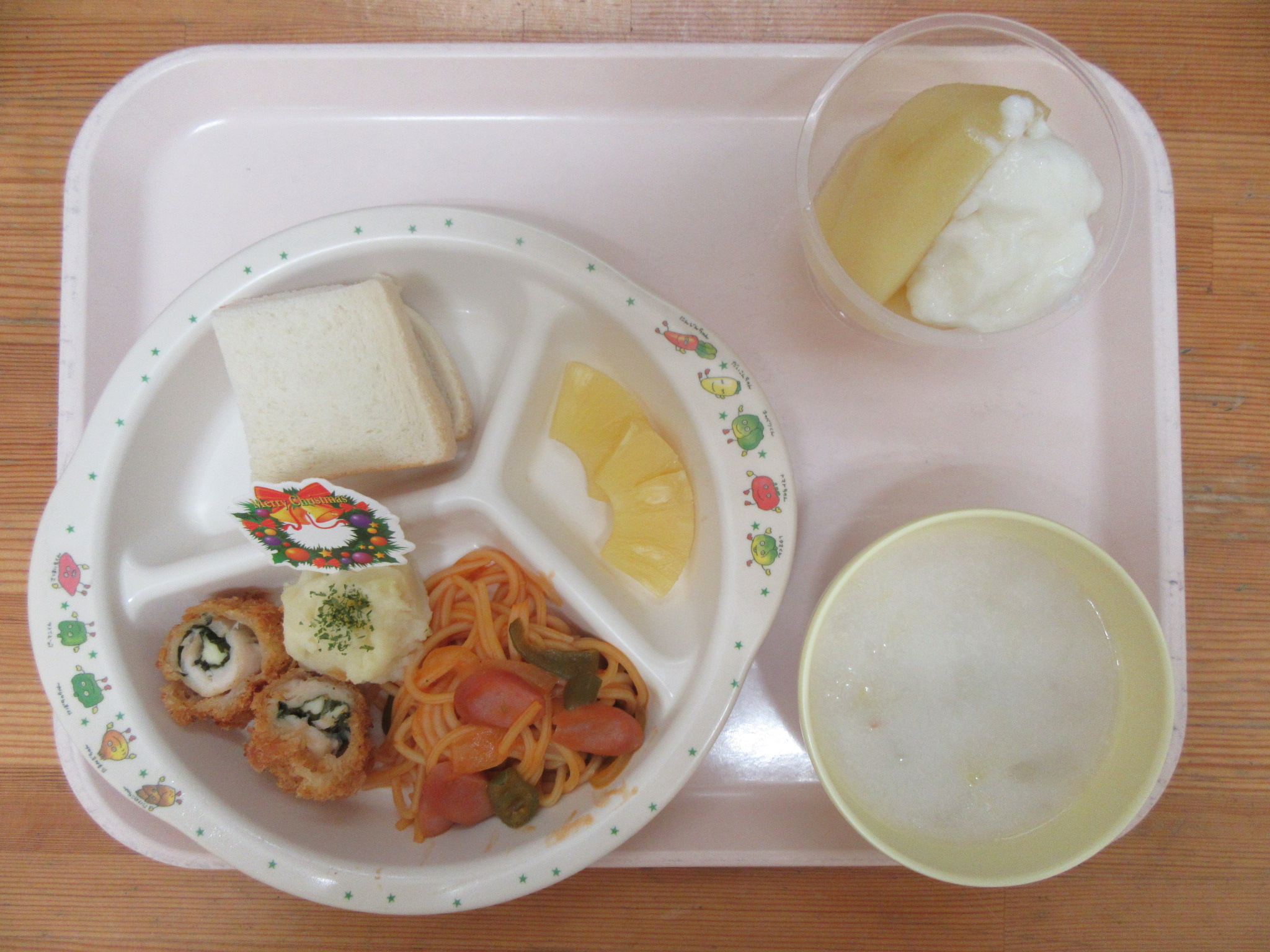・サンドイッチ ・ささみチーズフライ ・ナポリタン ・マッシュポテト ・ミルクスープ ・パイン缶