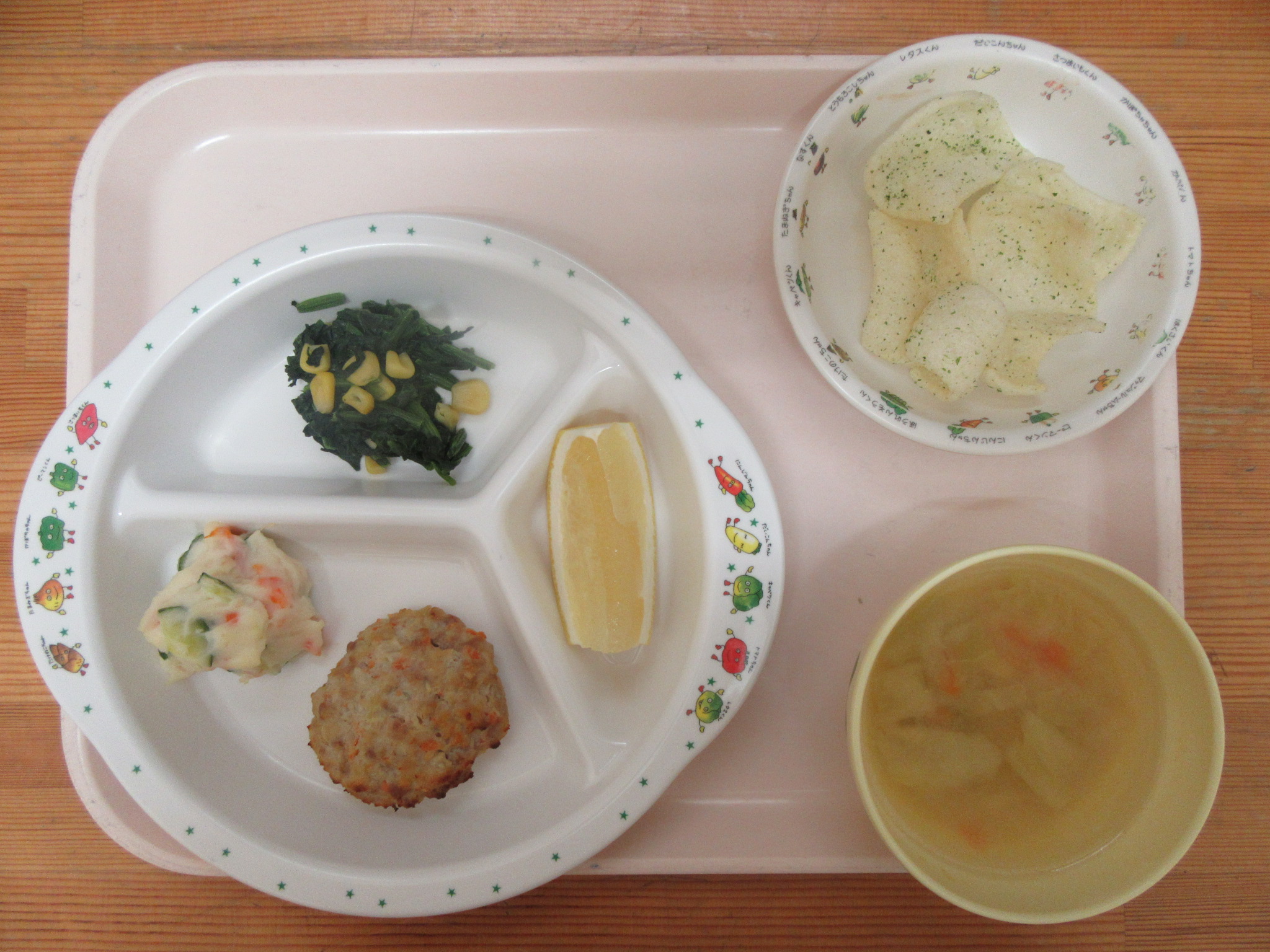・つくね焼き ・キャベツとトマトのサラダ ・里芋のごま煮 ・ジャガニラスープ ・バナナ