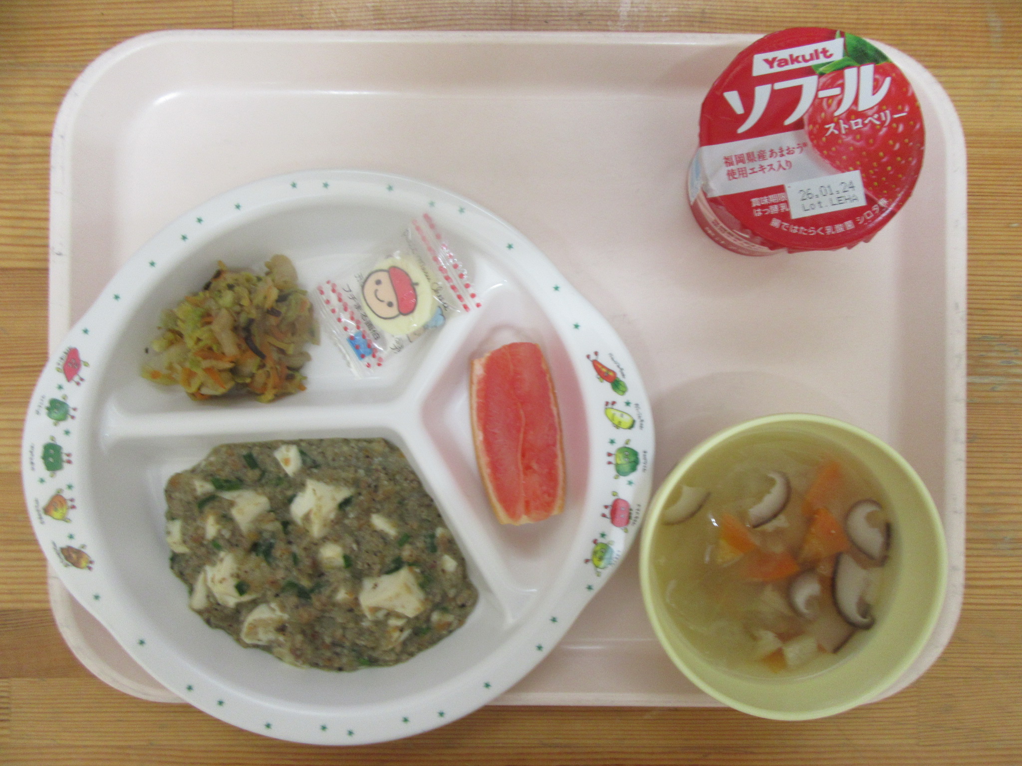 ・マーボー豆腐 ・白菜の塩昆布和え ・チーズ ・ユウガオの味噌汁 ・グレープフルーツ
