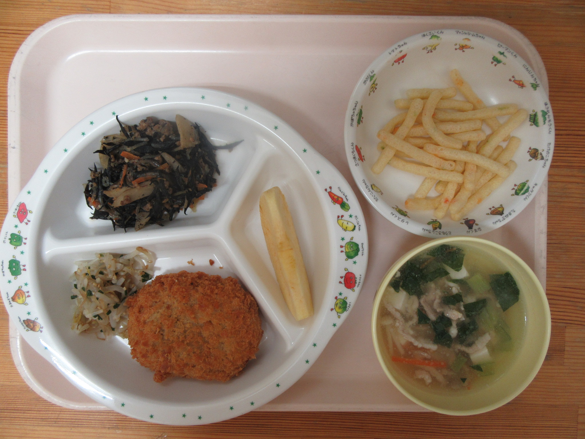 ・コロッケ ・ひじき煮 ・もやしのナムル ・キノコと豆腐の味噌汁 ・リンゴ