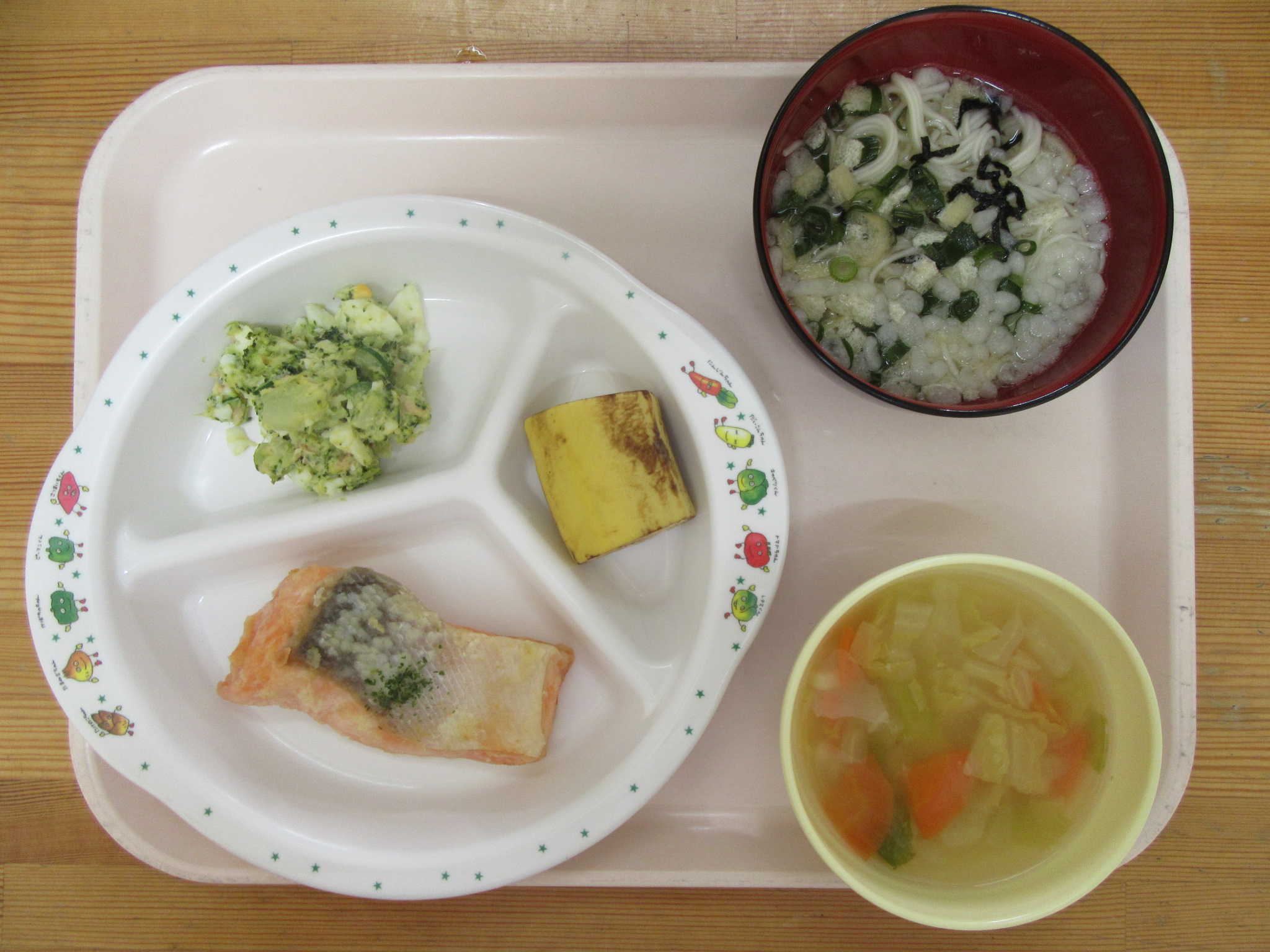 ・ポテト春巻き ・ブロッコリーのサラダ ・あじのり ・しそとわかめの味噌汁 ・バナナ