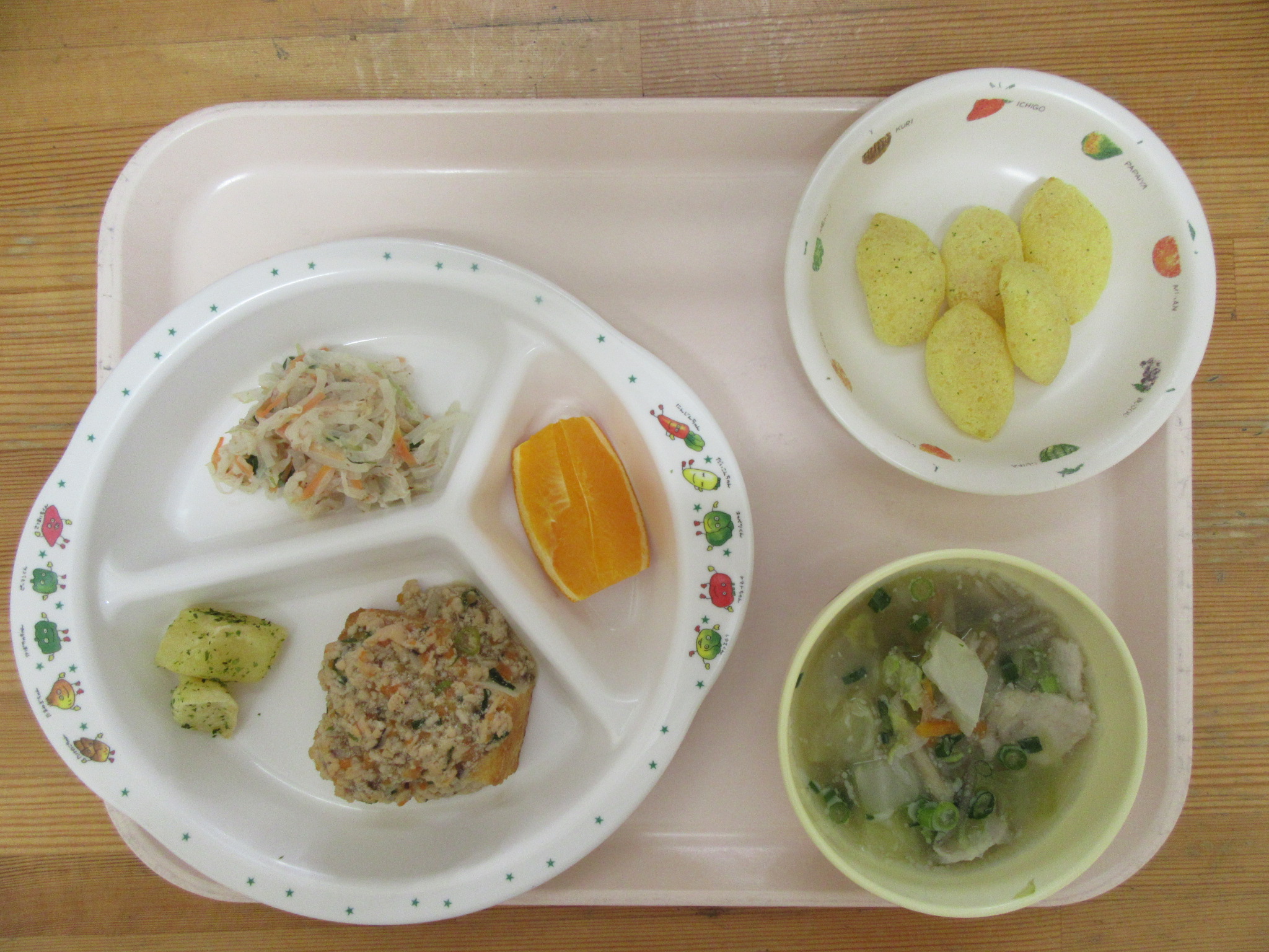 ・肉じゃが ・竹輪の天ぷら ・もやしのナムル ・つみれ汁 ・オレンジ