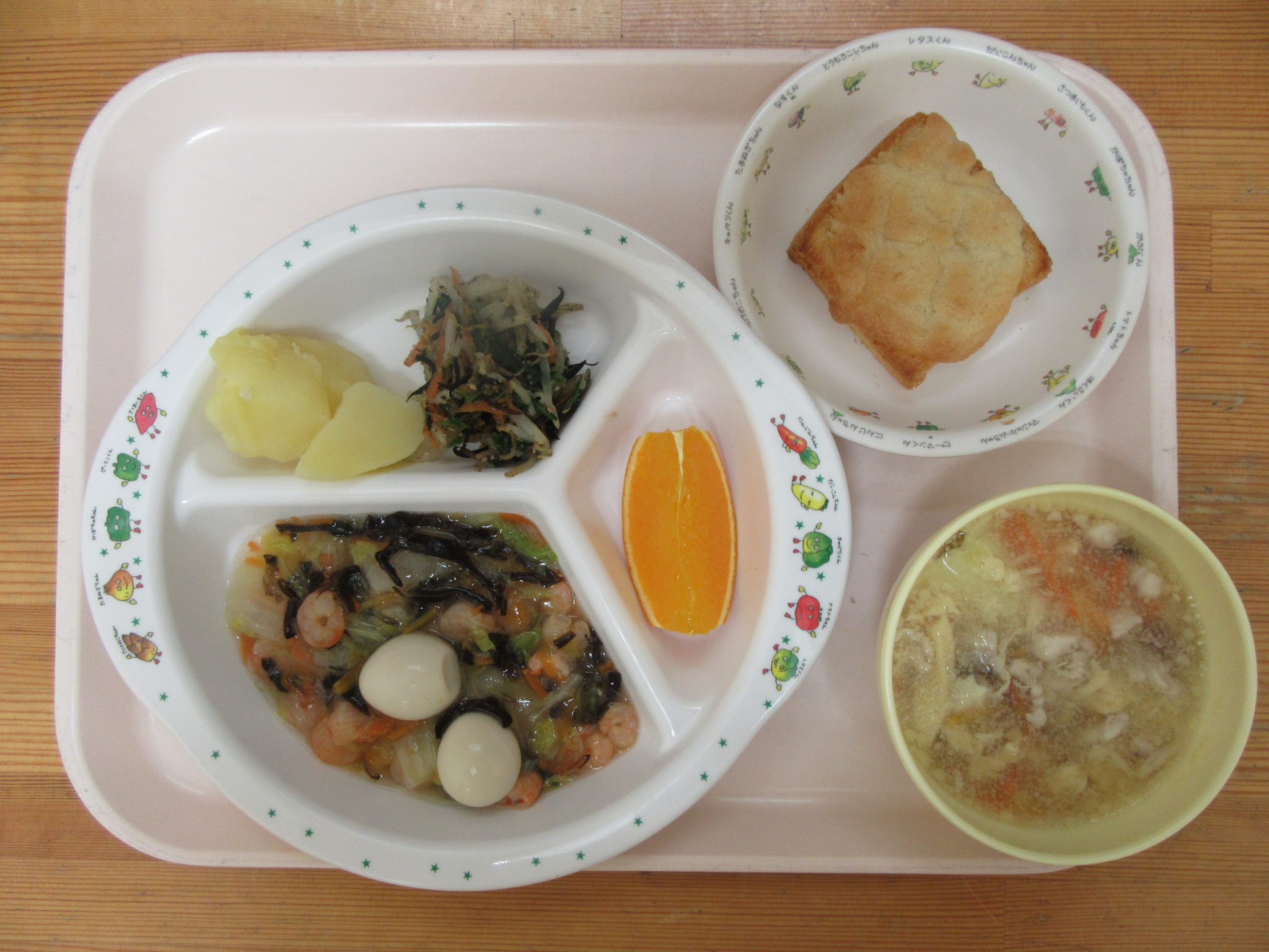 ・タラの野菜あんかけ ・からあげ ・厚揚げの煮物 ・なめこの味噌汁 ・グレープフルーツ