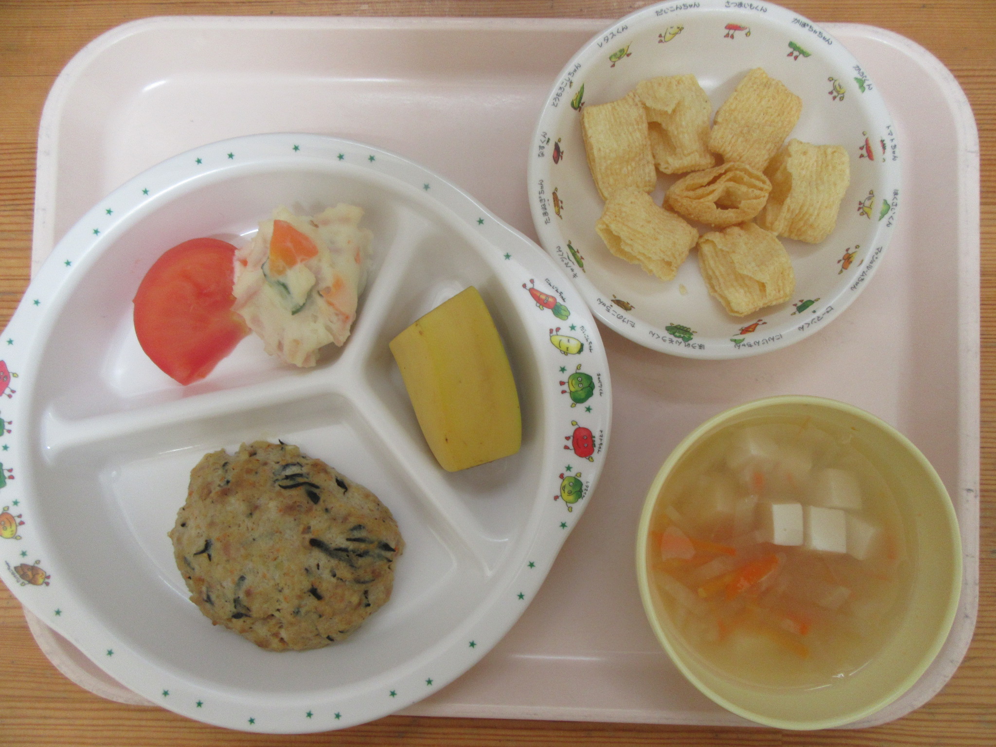 ・ひじき入り豆腐ハンバーグ ・ポテトサラダ ・トマト ・大根と人参の味噌汁 ・バナナ
