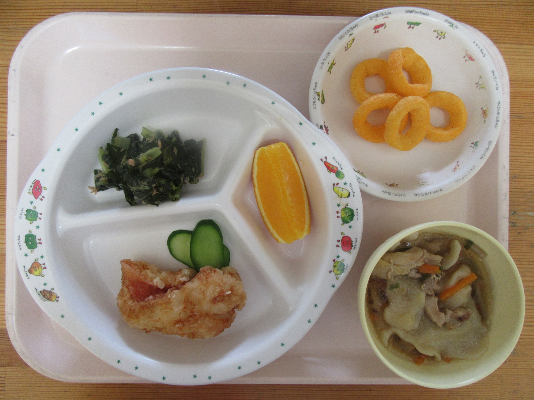 ・赤魚の竜田揚げ ・小松菜とツナのうま煮 ・すいとん汁 ・オレンジ
