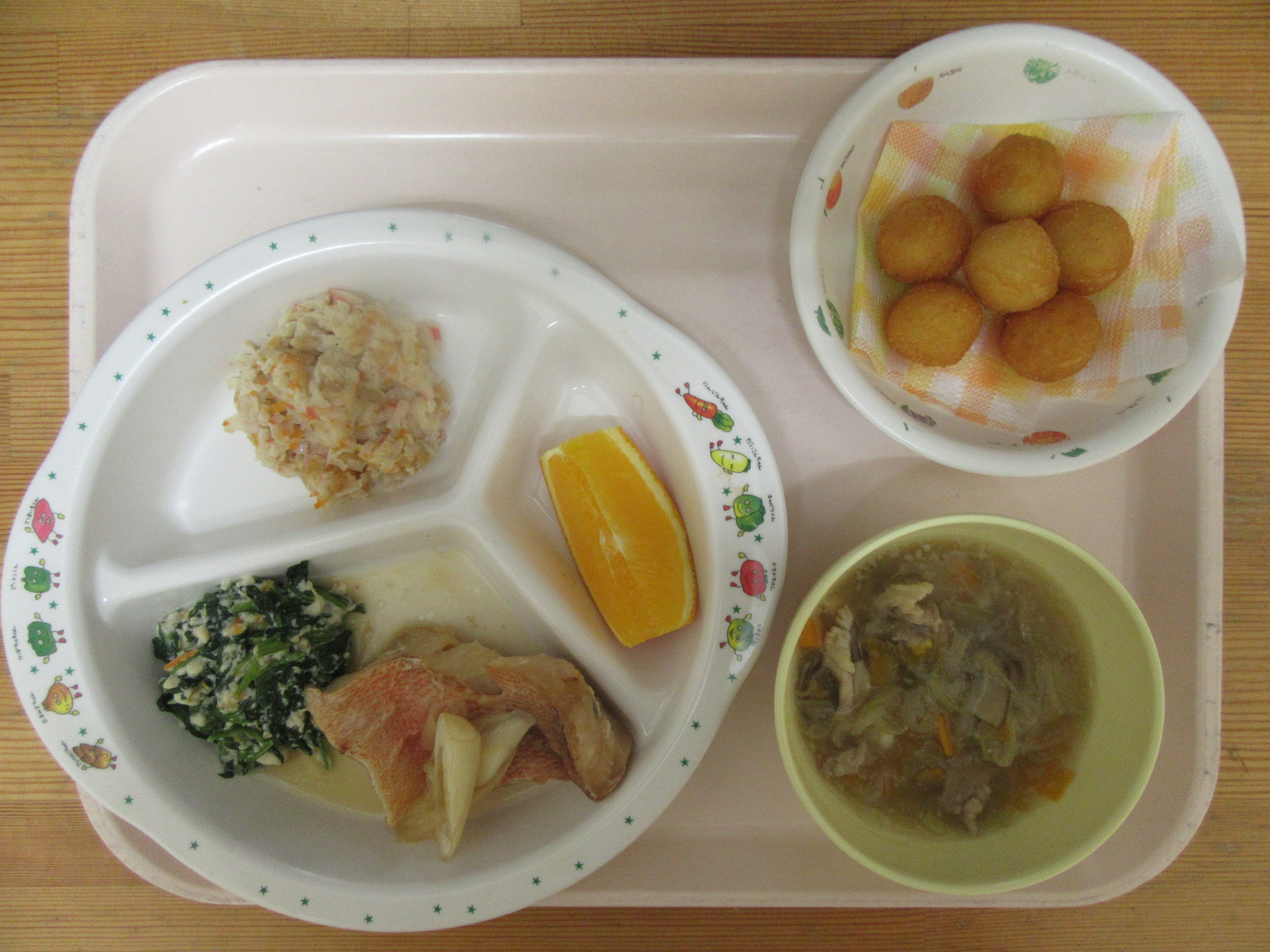 ・赤魚の煮つけ ・ほうれん草の白和え ・切干納豆 ・豚汁 ・オレンジ