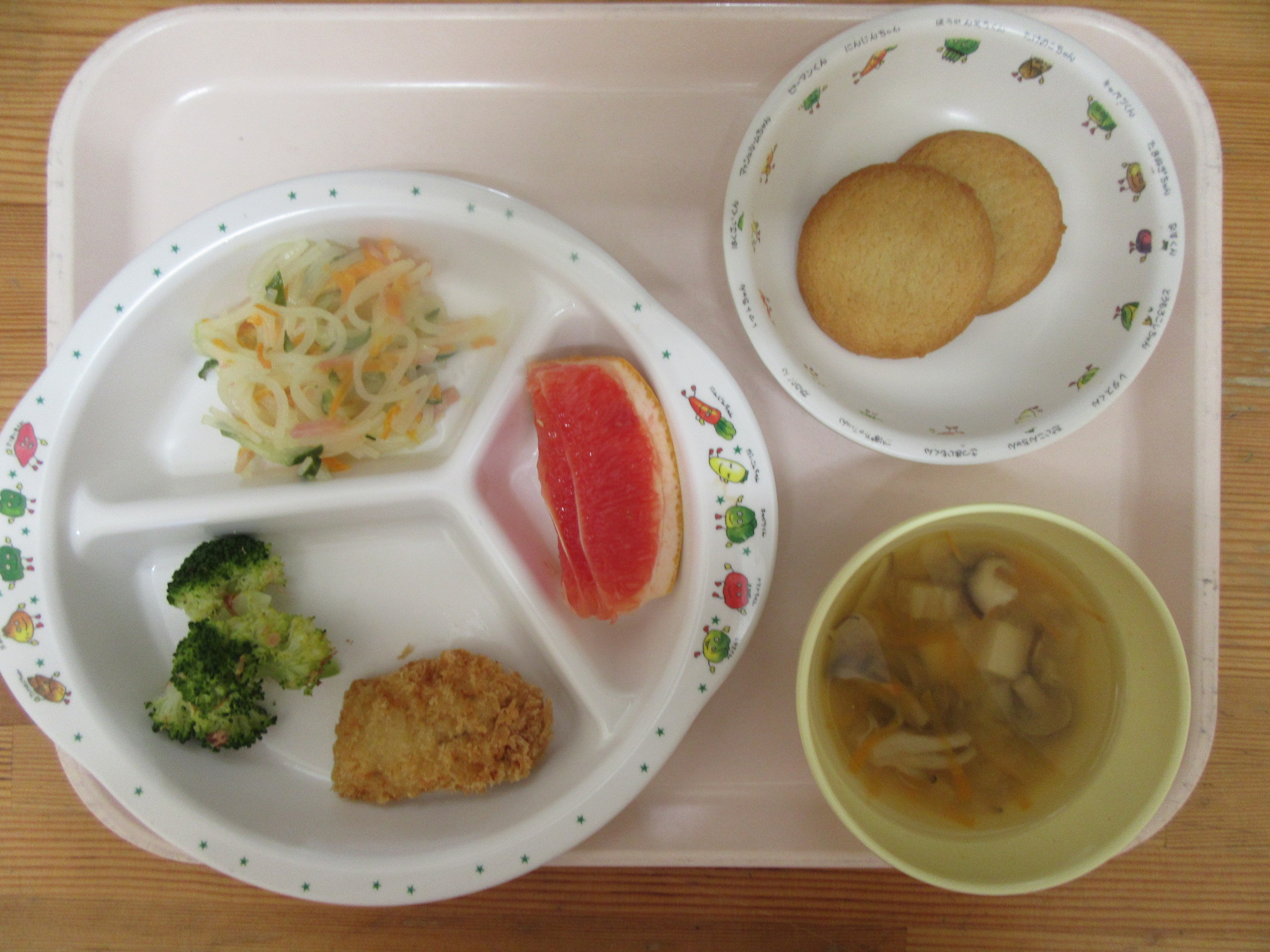 ・アジフライ ・マロニーサラダ ・ブロッコリー ・キノコと豆腐の味噌汁 ・グレープフルーツ