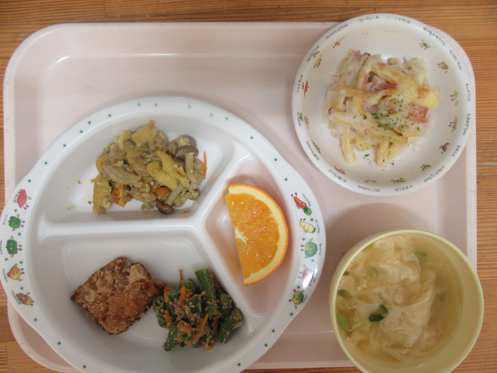 ・サバの竜田揚げ ・油揚げのカレー煮 ・いんげんの胡麻和え ・かきたま汁 ・オレンジ