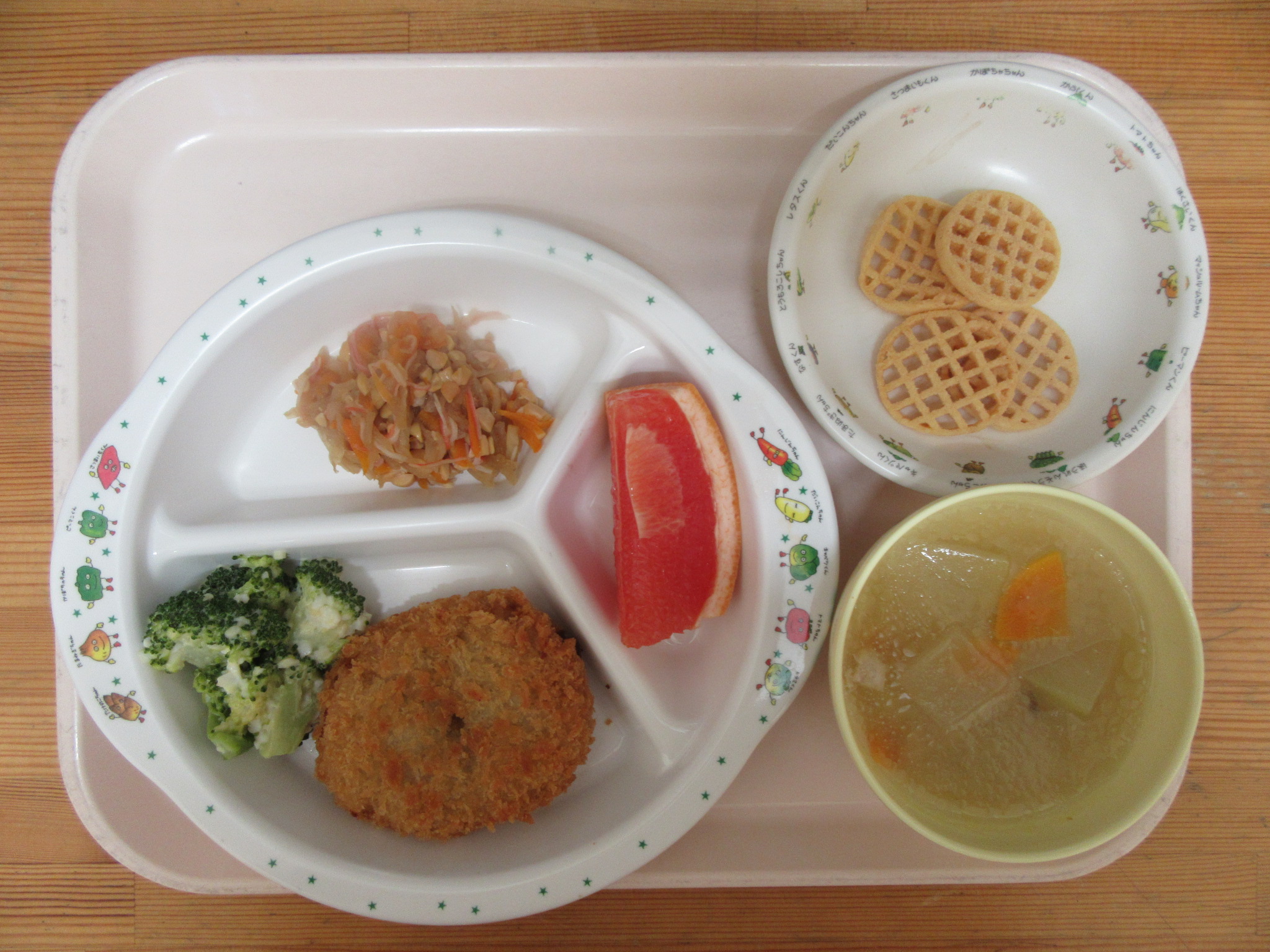 ・コロッケ ・ブロッコリーサラダ ・切り干し納豆 ・ゆうがおの味噌汁 ・グレープフルーツ