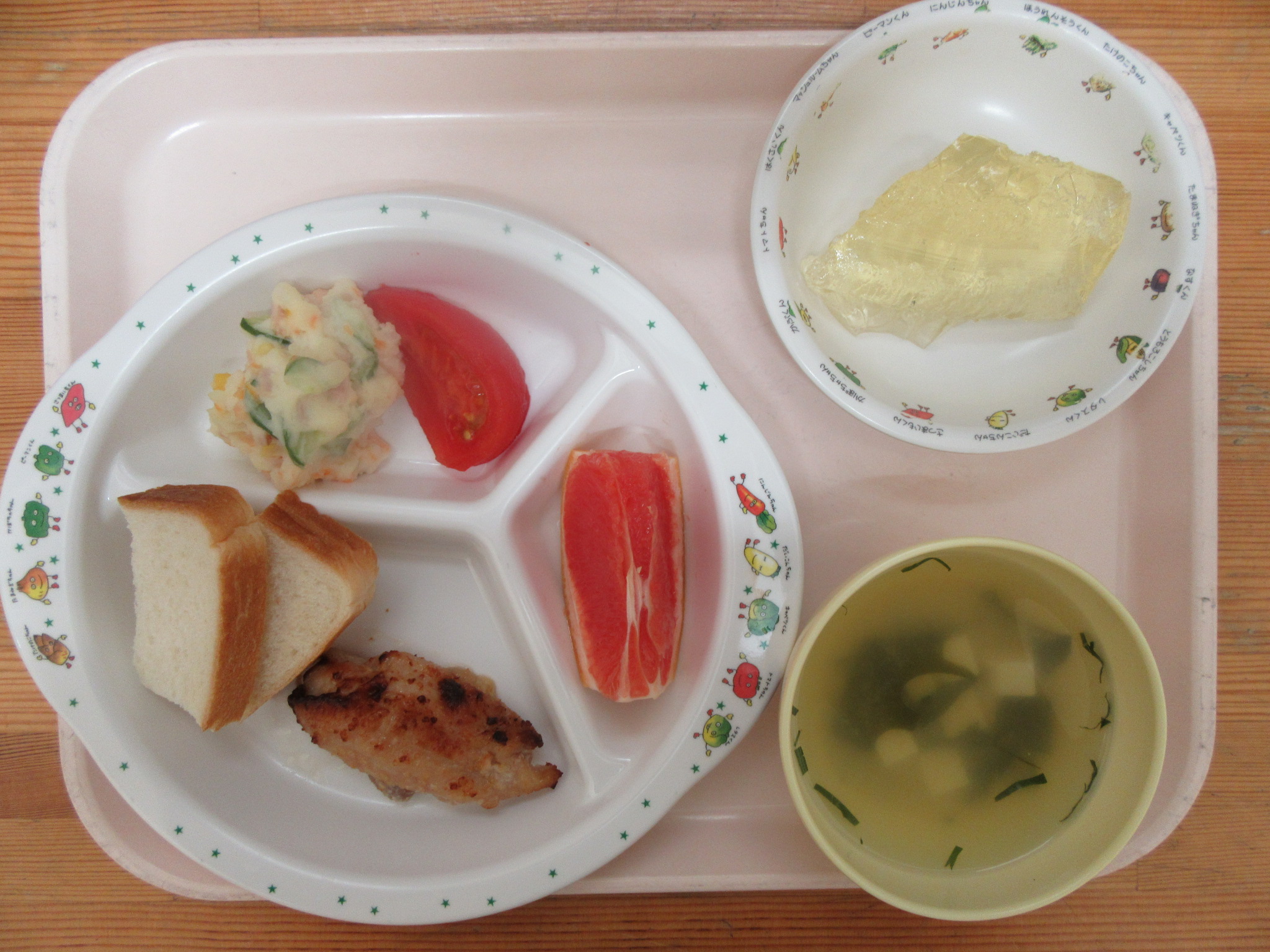 ・鶏肉の塩こうじ焼き ・ポテトサラダ ・トマト ・しそとわかめの味噌汁 ・グレープフルーツ
