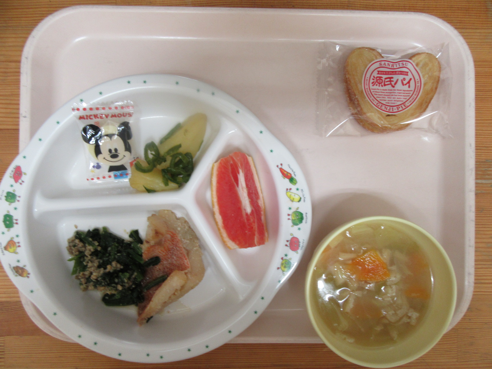・赤魚のごま煮 ・ジャガイモとピーマン炒め ・チーズ ・キャベツと油揚げの味噌汁 ・グレープフルーツ