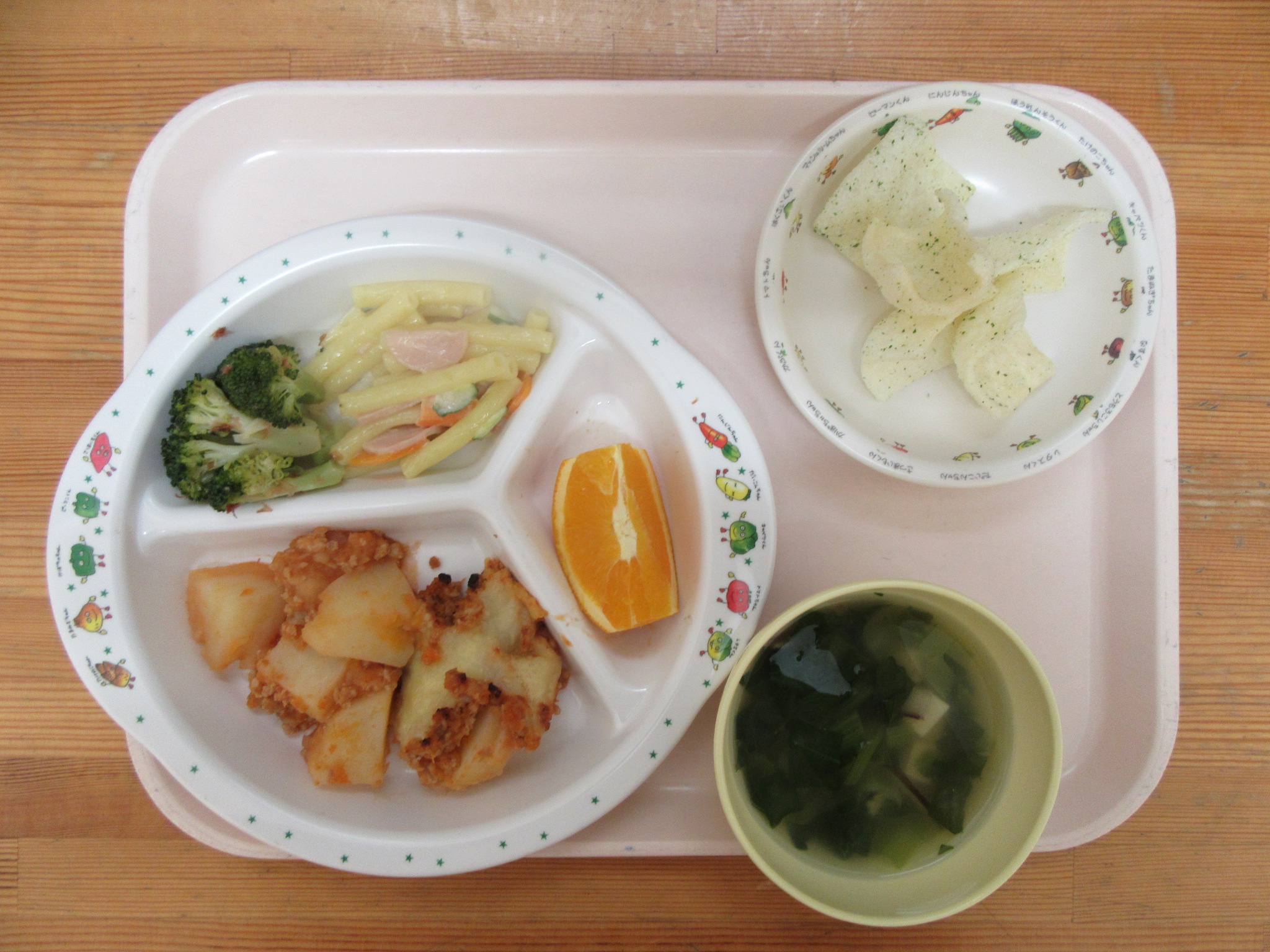 ・ジャガイモのミートチーズ焼き ・マカロニサラダ ・ブロッコリー ・小松菜としいたけの味噌汁 ・オレンジ