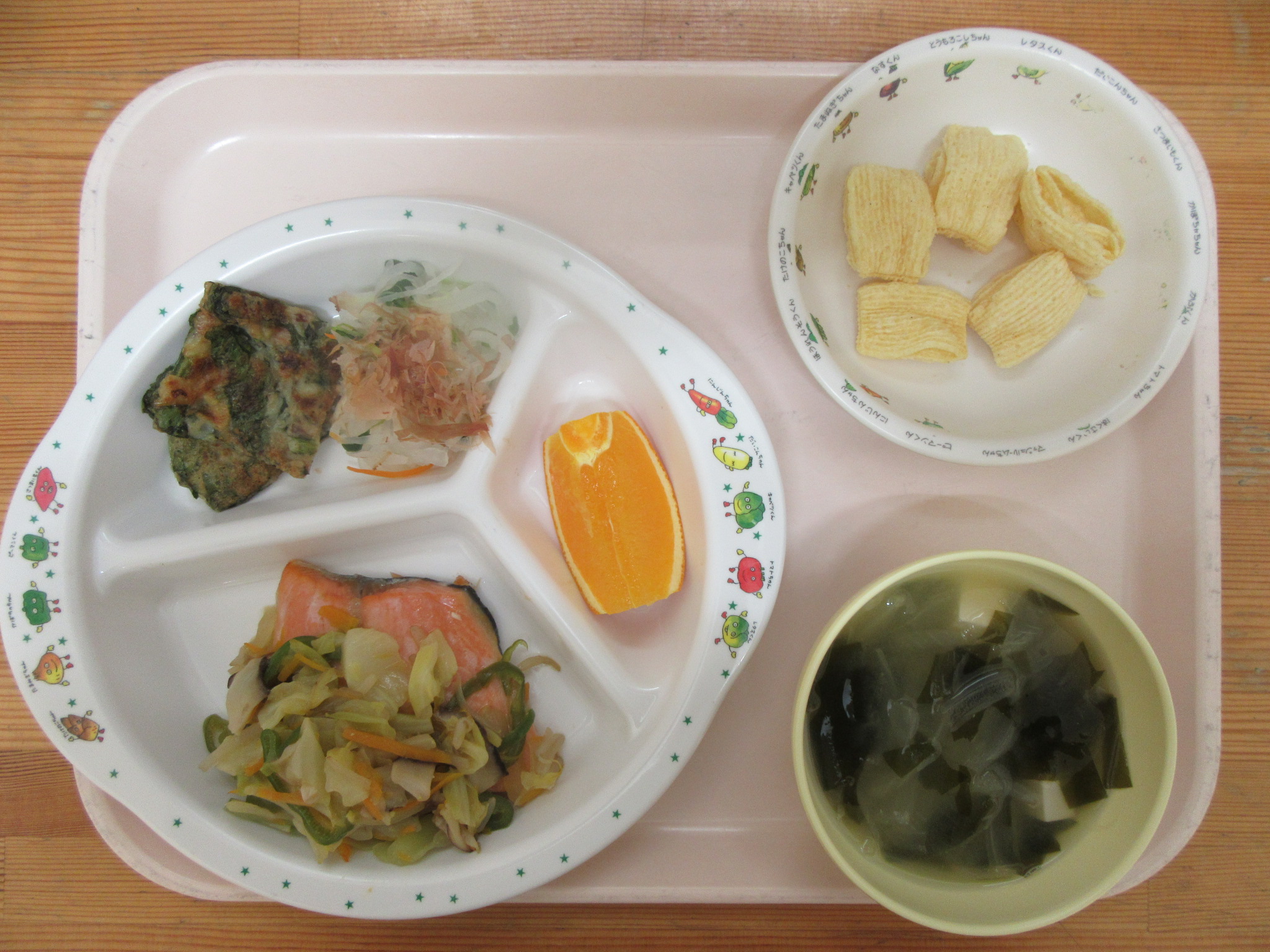 ・鮭のちゃんちゃん焼き風 ・大根サラダ ・ヒラヤーチー風 ・豆腐とわかめの味噌汁 ・オレンジ