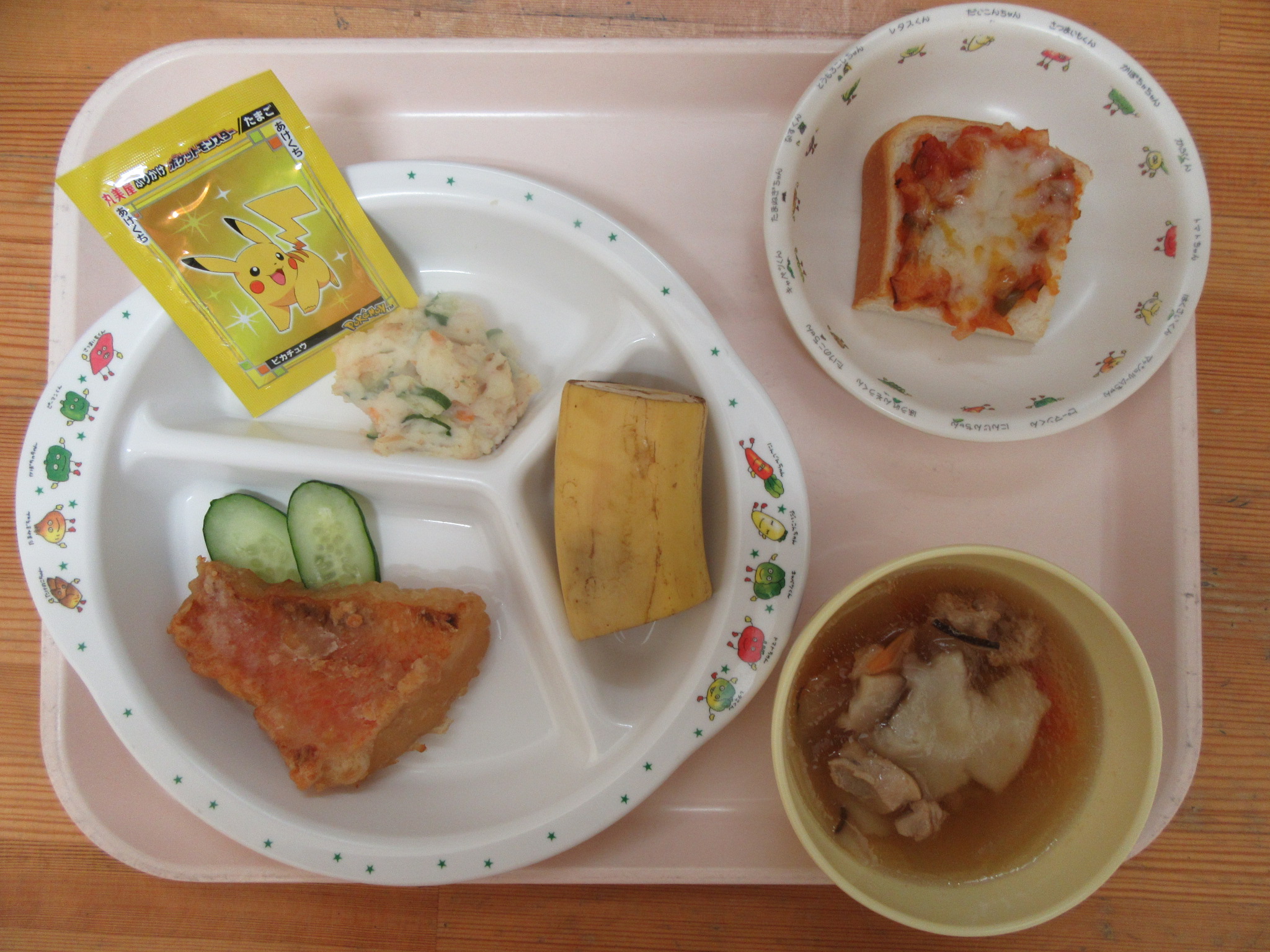 ・赤魚の竜田揚げ ・和風ポテトサラダ ・ふりかけ ・すいとん汁 ・バナナ