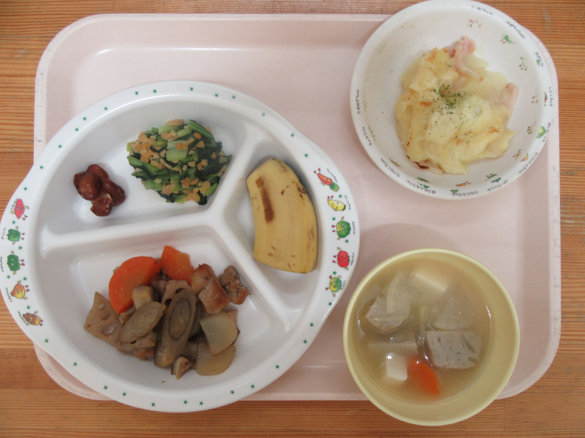 ・筑前煮 ・小松菜の納豆和え ・煮豆 ・つみれ汁 ・バナナ