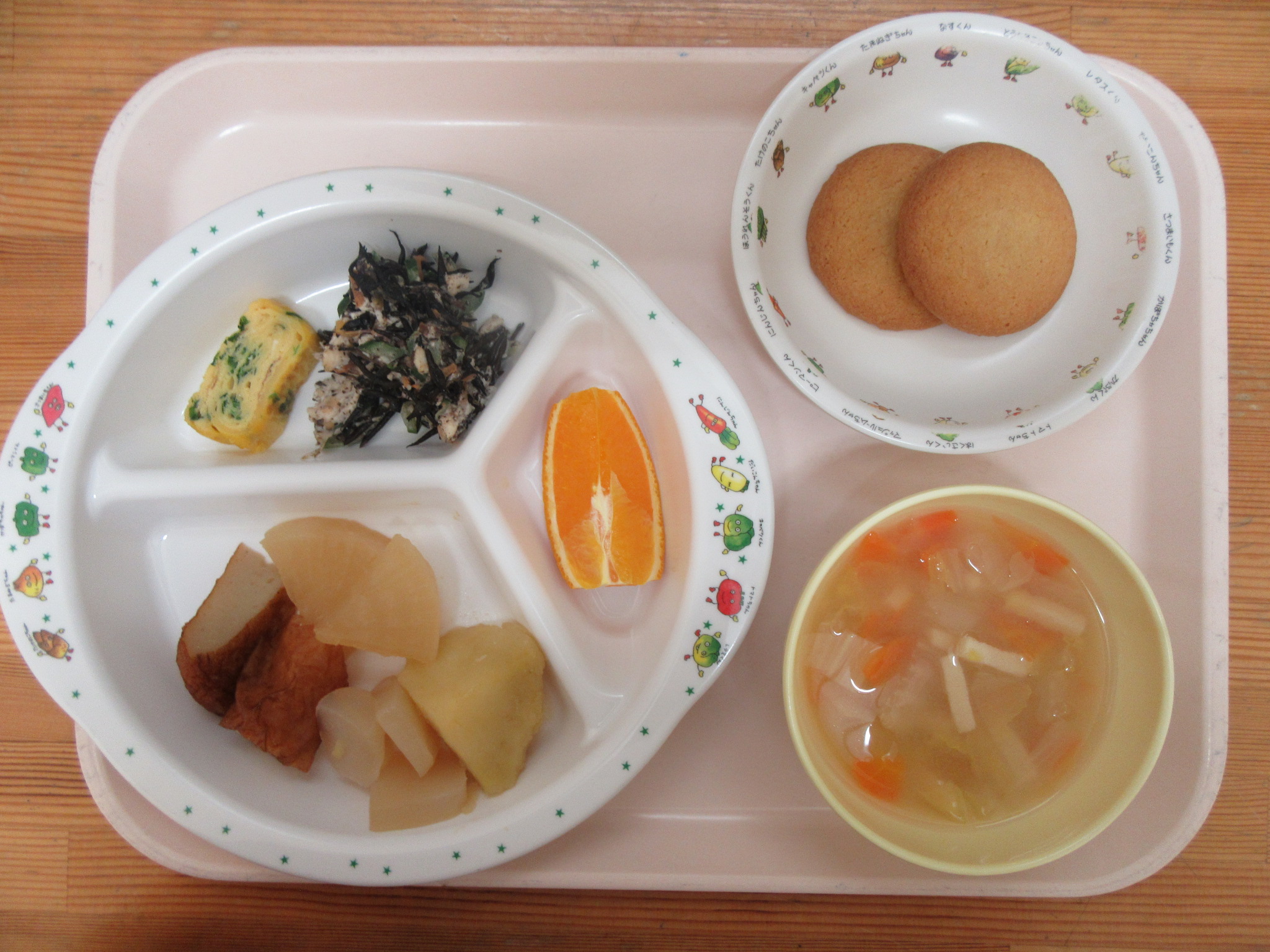 ・おでん ・ひじきサラダ ・卵焼き ・白菜と人参の味噌汁 ・オレンジ