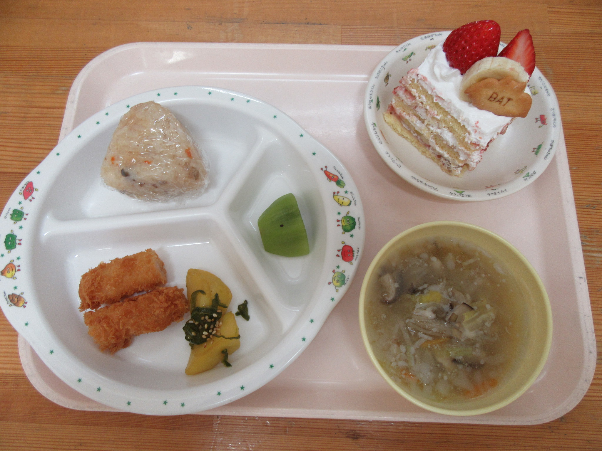 ・炊き込みご飯 ・エビフライ ・ジャガイモとピーマンの胡麻炒め ・豚汁 ・キウイ