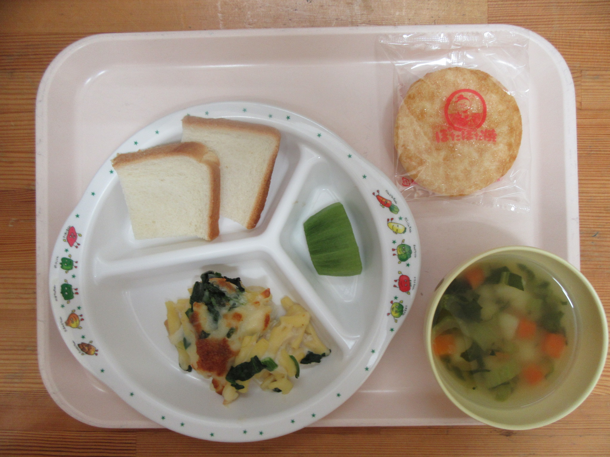 ・チキンとほうれん草のマカロニグラタン ・食パン ・野菜スープ ・キウイ
