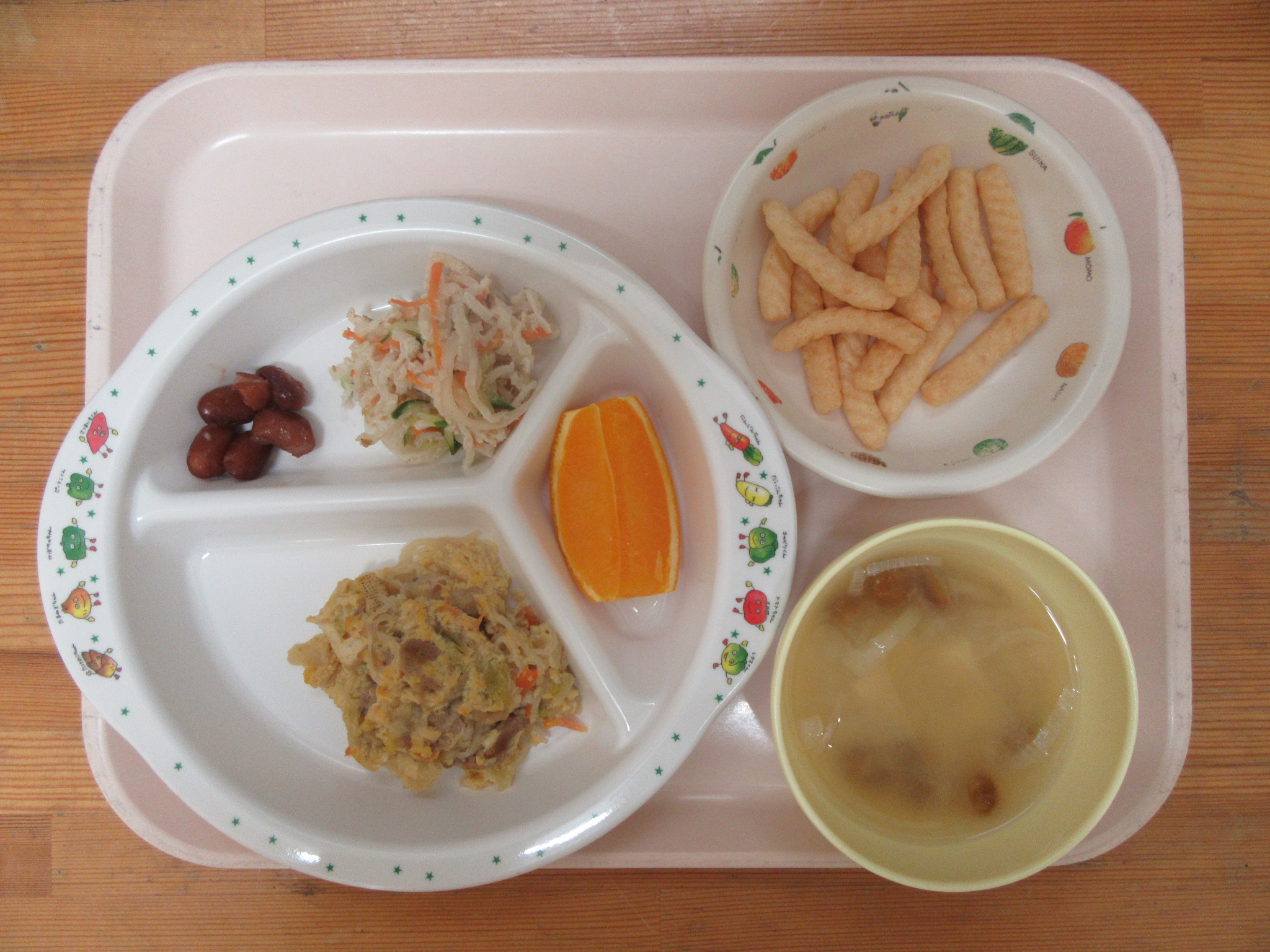 ・すき焼き風卵とじ ・切干大根のサラダ ・煮豆 ・なめこの味噌汁 ・オレンジ