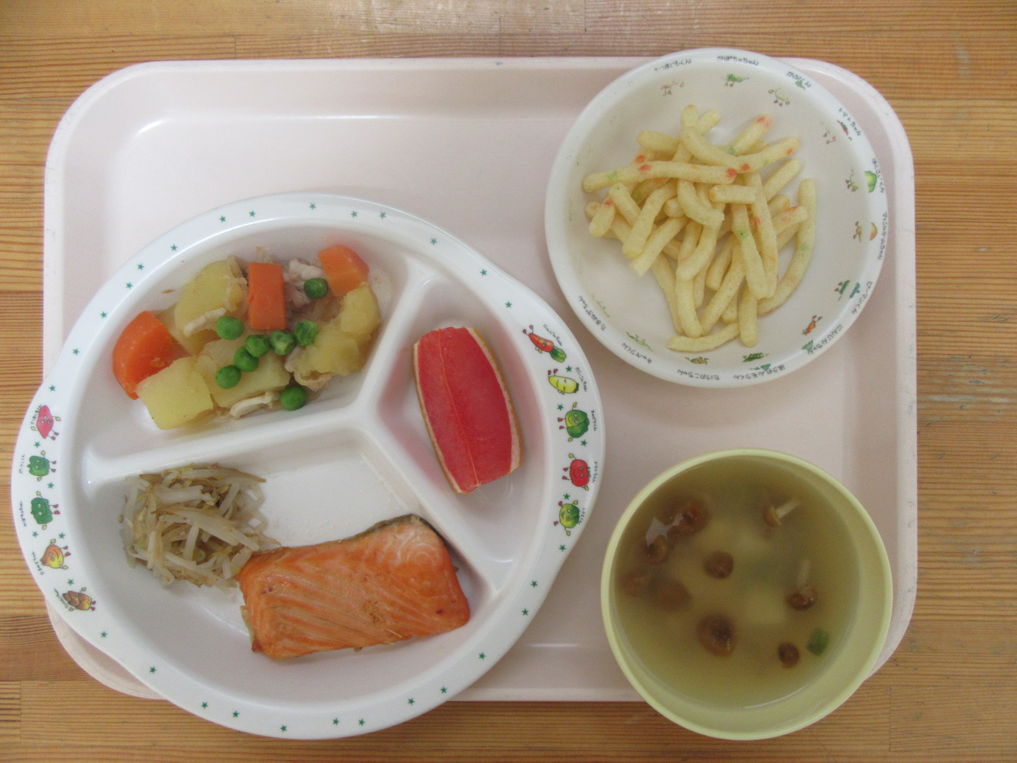 ・鮭の塩焼き ・肉じゃが ・もやしのナムル ・なめこの味噌汁 ・グレープフルーツ