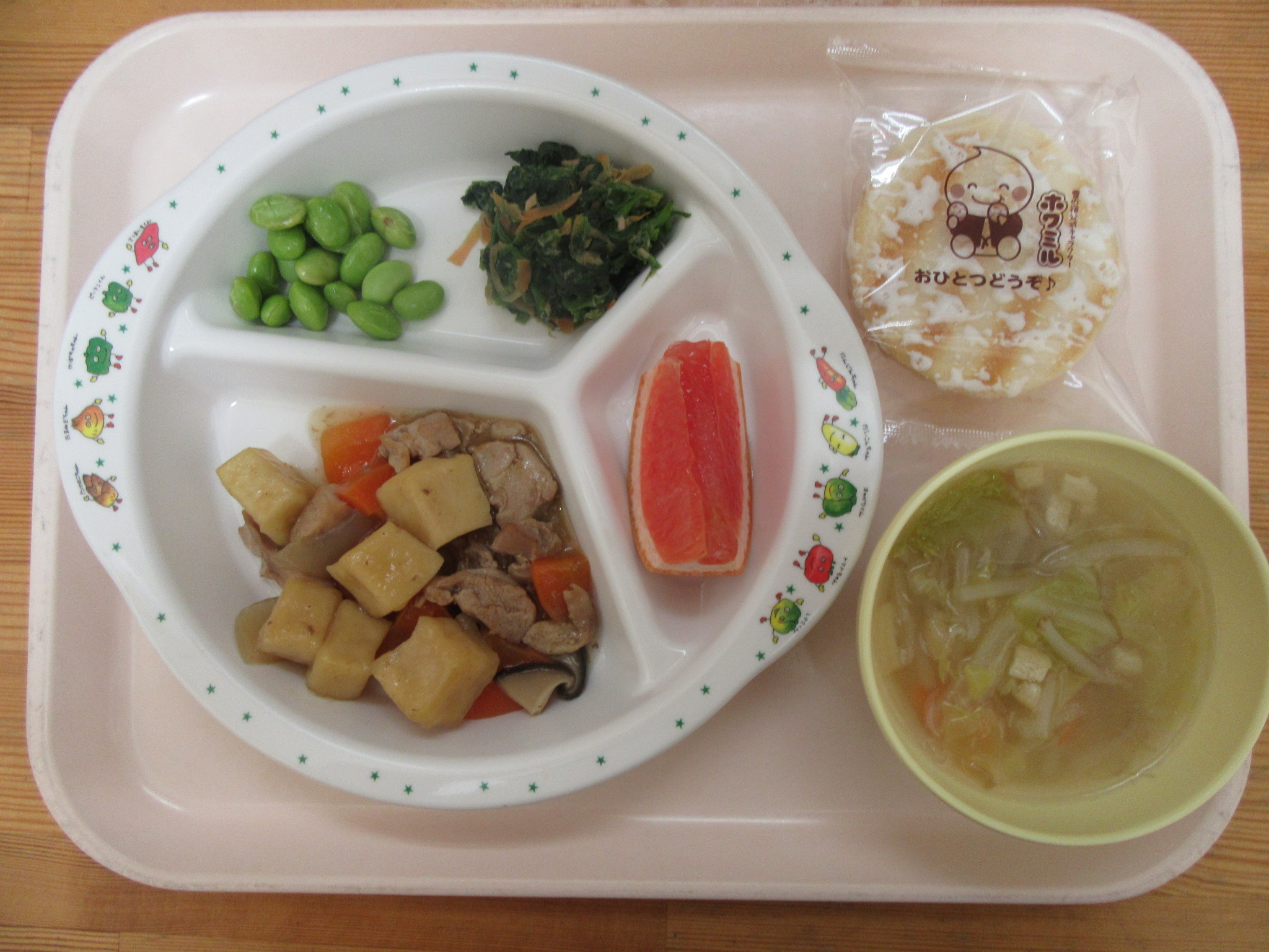 ・高野豆腐のオランダ煮 ・ほうれん草のツナサラダ ・枝豆 ・もやしと油揚げのみそ汁 ・グレープフルーツ