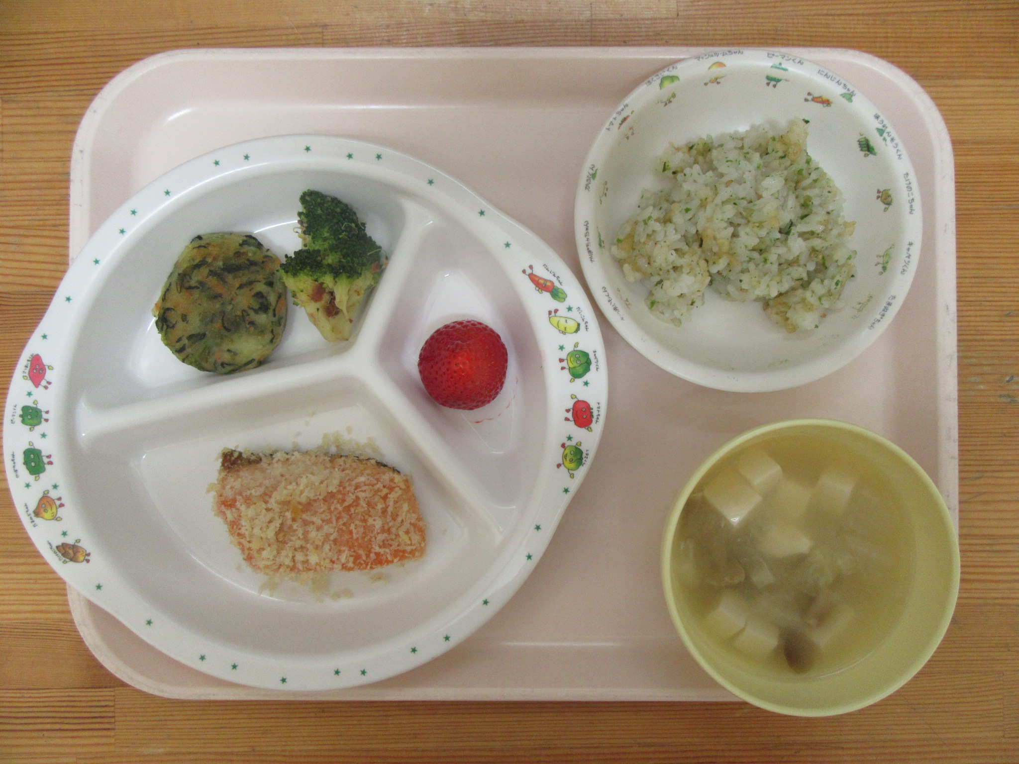 ・鮭のパン粉焼き ・小松菜のポテトおやき風 ・ブロッコリー ・大根としめじの味噌汁 ・イチゴ