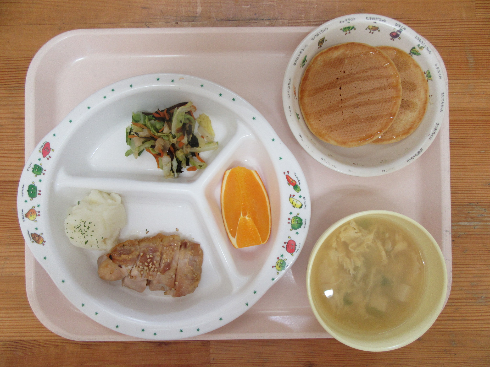・鶏の胡麻みそ焼き ・キャベツののり和え ・マッシュポテト ・かきたま汁 ・オレンジ