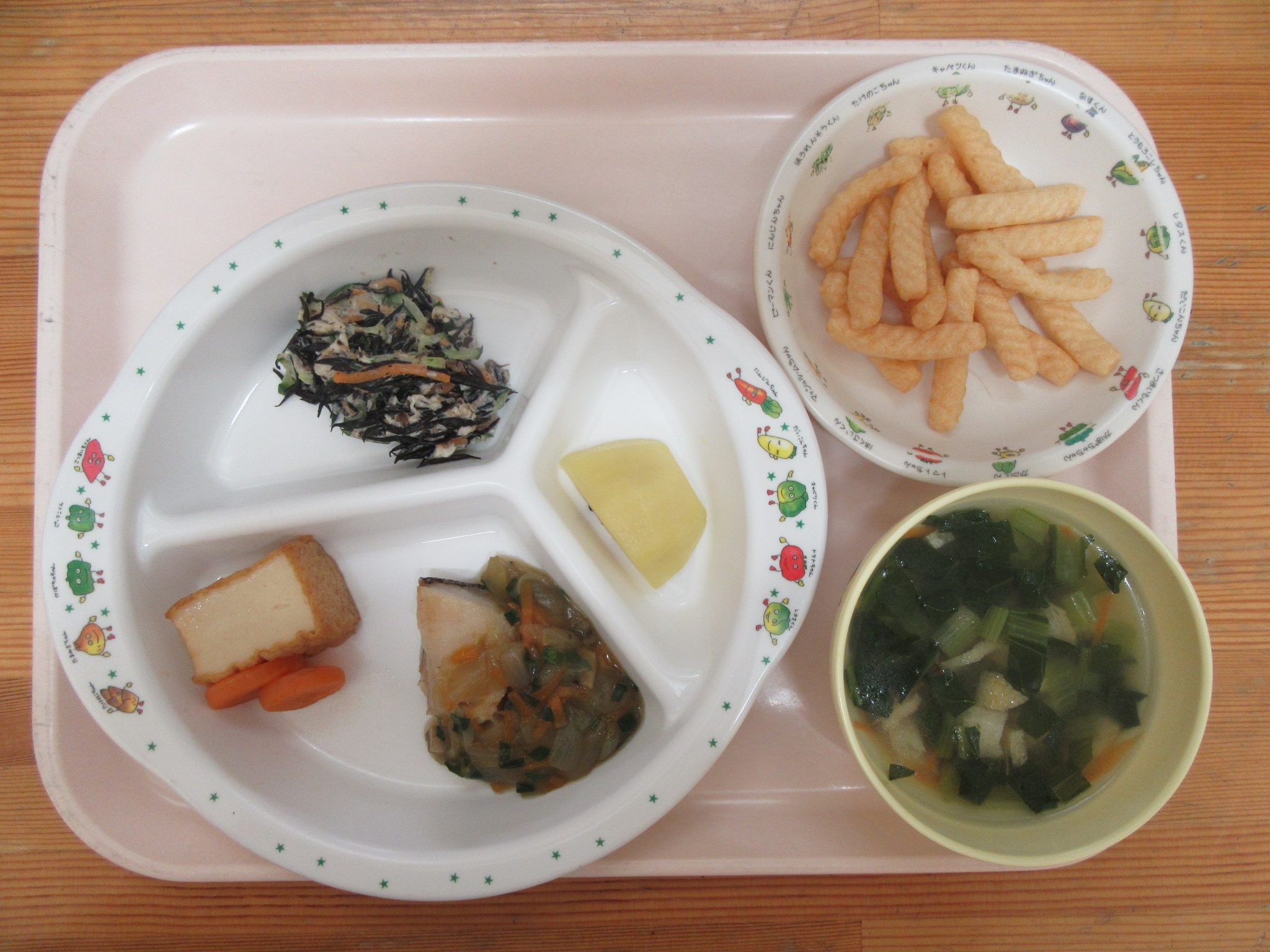 ・タラの野菜あんかけ ・ひじきサラダ ・厚揚げの煮物 ・小松菜と油揚げの味噌汁 ・キウイ