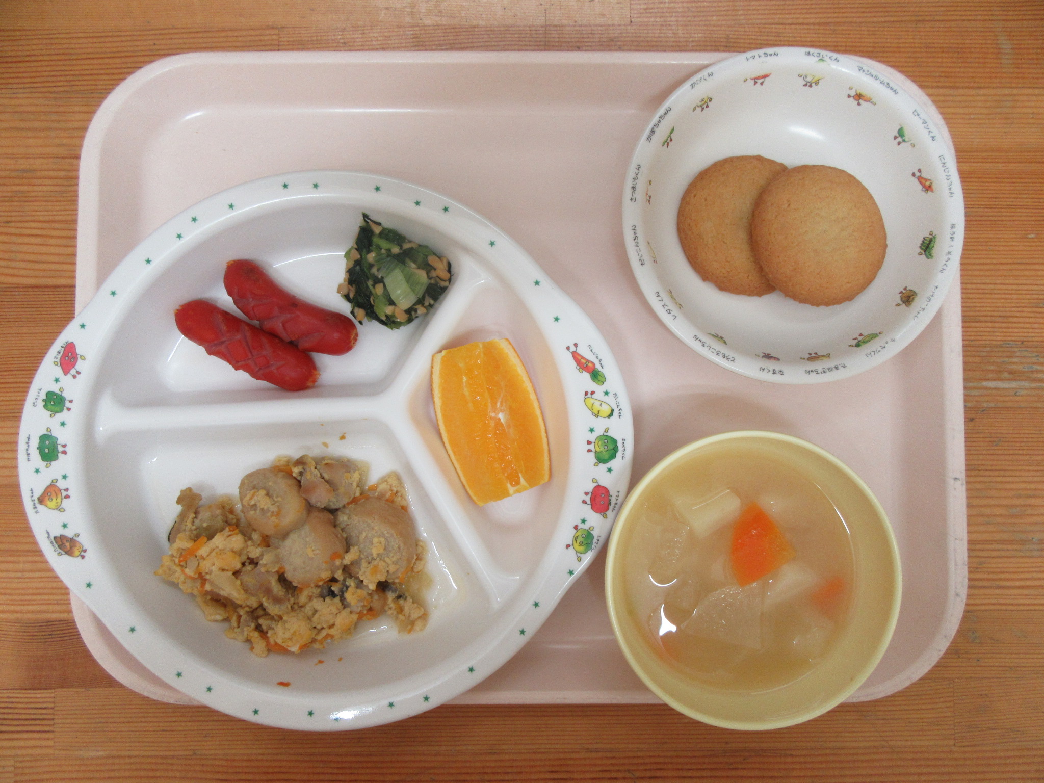 ・焼き麩の卵とじ ・小松菜の納豆和え ・ウインナー ・大根と人参の味噌汁 ・オレンジ