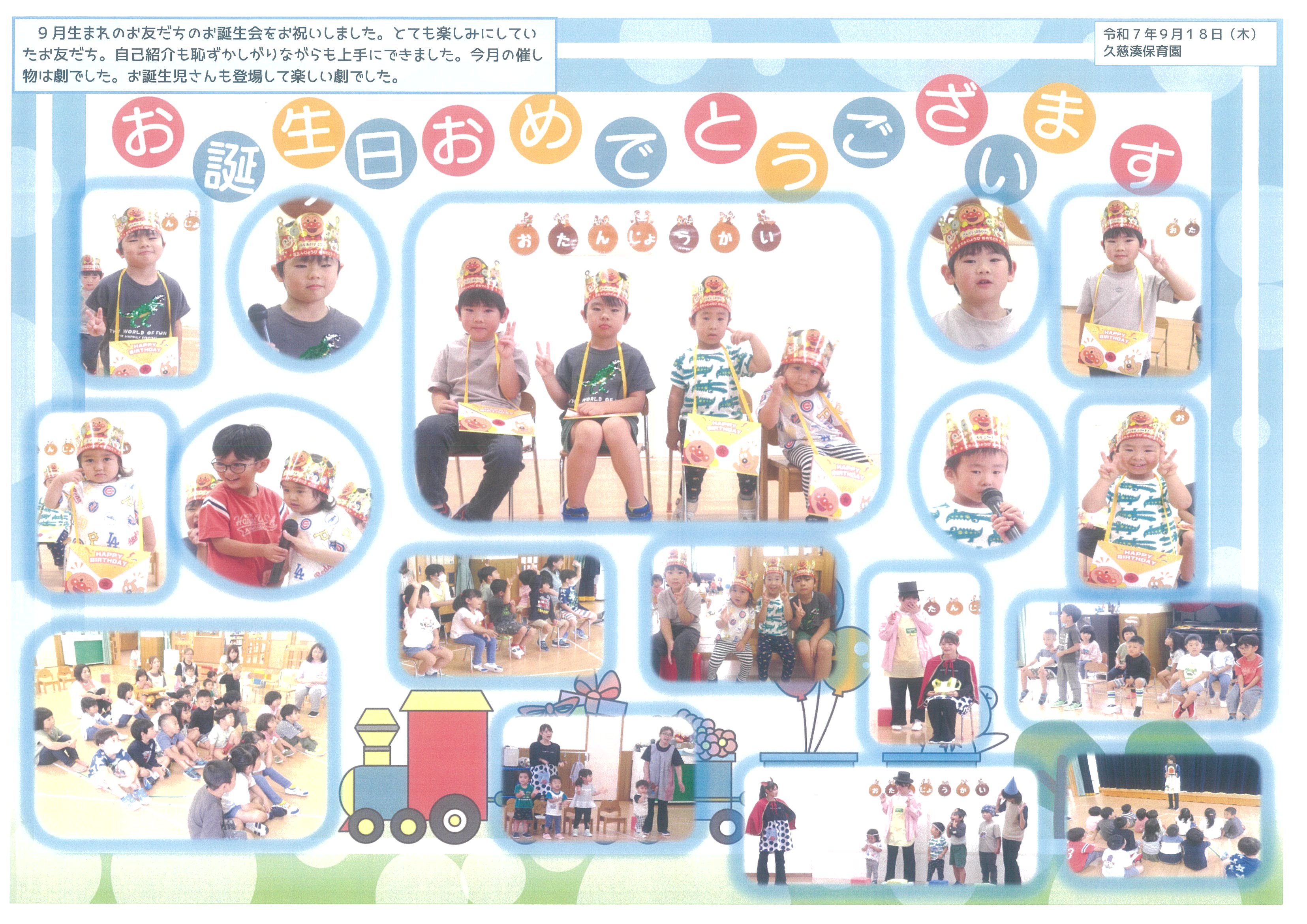 8月生まれのお友だちのお誕生会をお祝いしました。とても嬉しそうにニコニコしながら入場してきたお誕生児さん