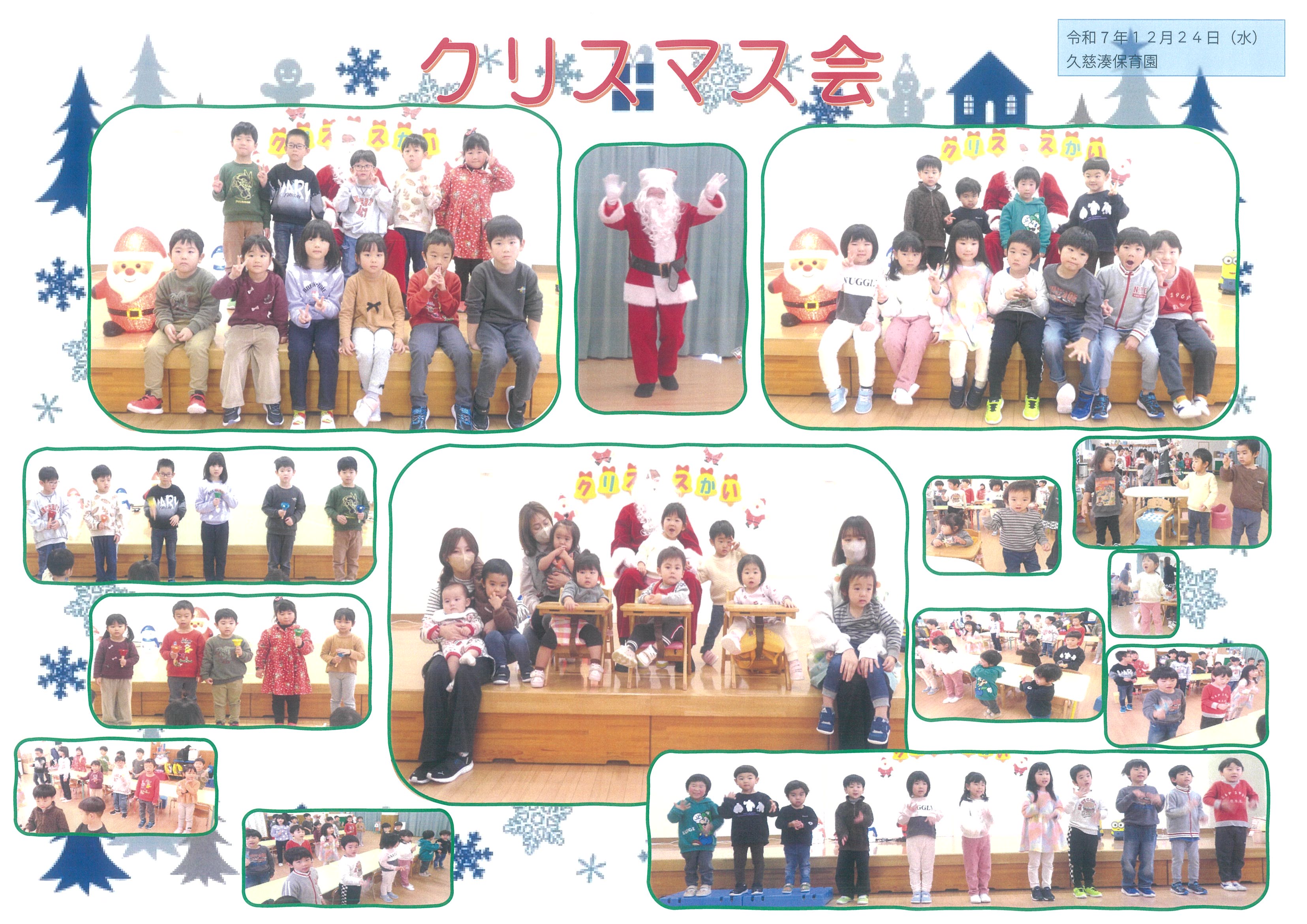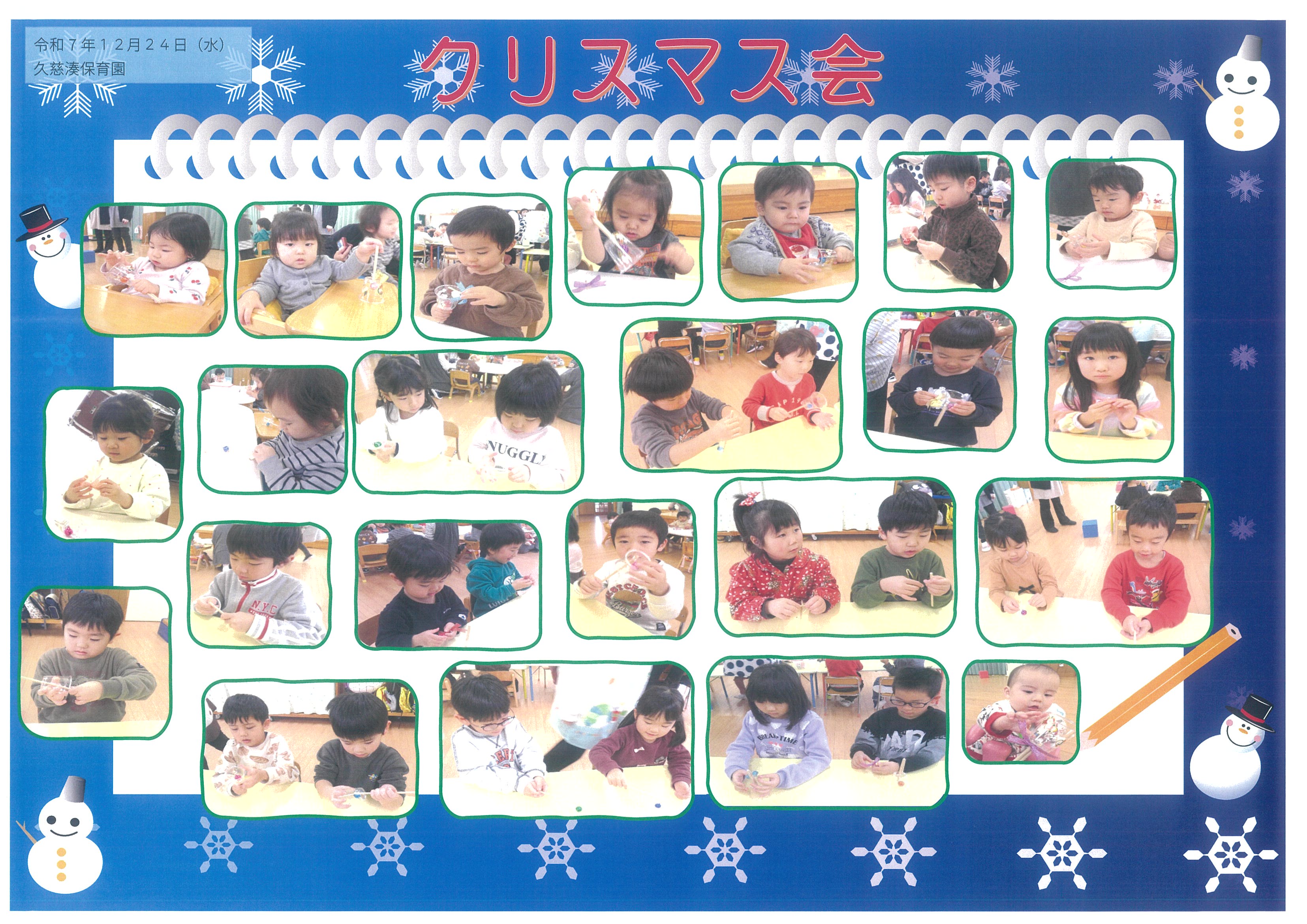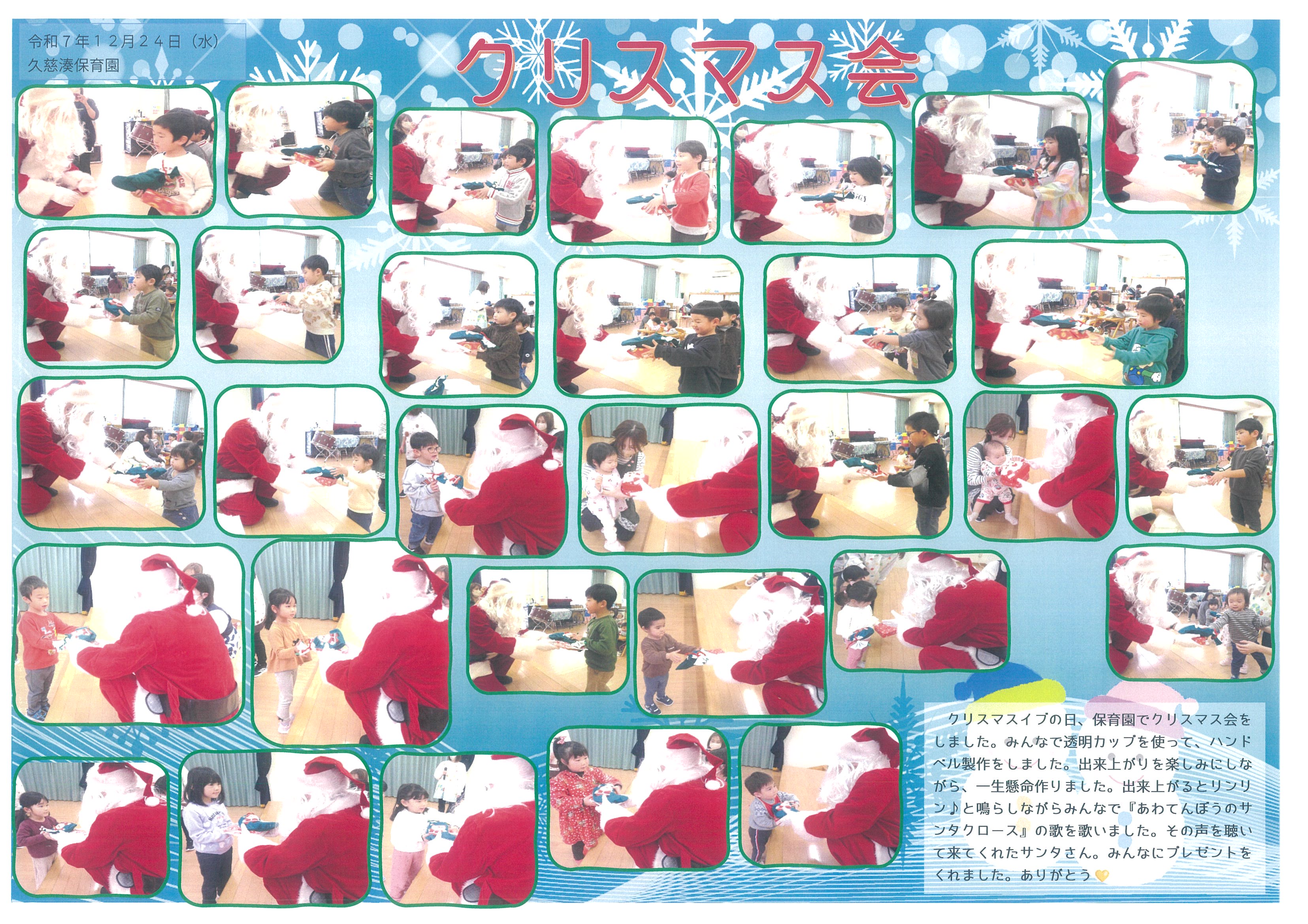 クリスマスイブの日、保育園でクリスマス会をしました。みんなでベルを作って、演奏して『あわてんぼうのサンタクロース』を歌いました。