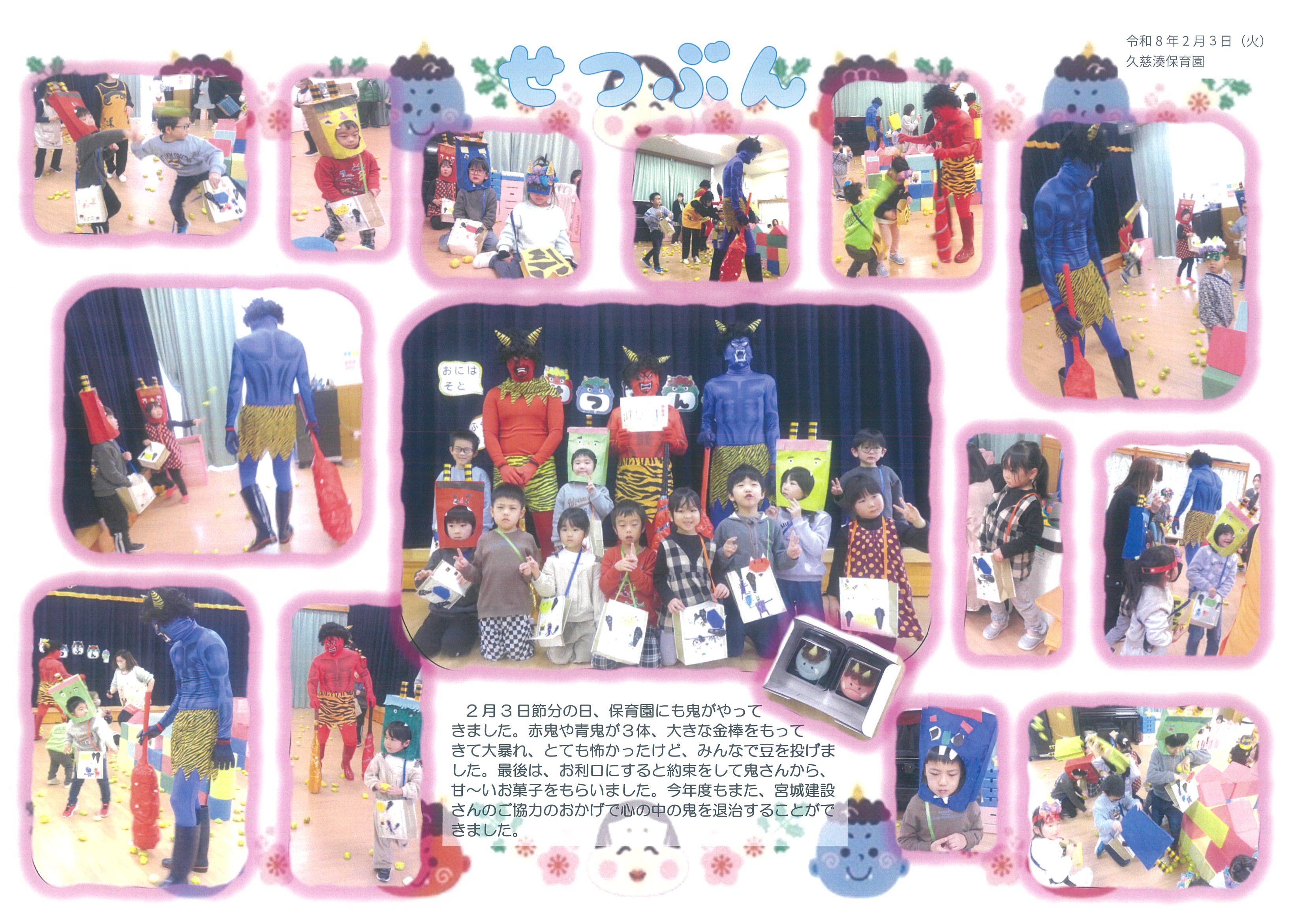 2月3日節分の日、保育園に鬼がやってきました。大きな体の3体の鬼、怖くて泣いたお友だちもたけどみんな頑張って豆を投げたよ